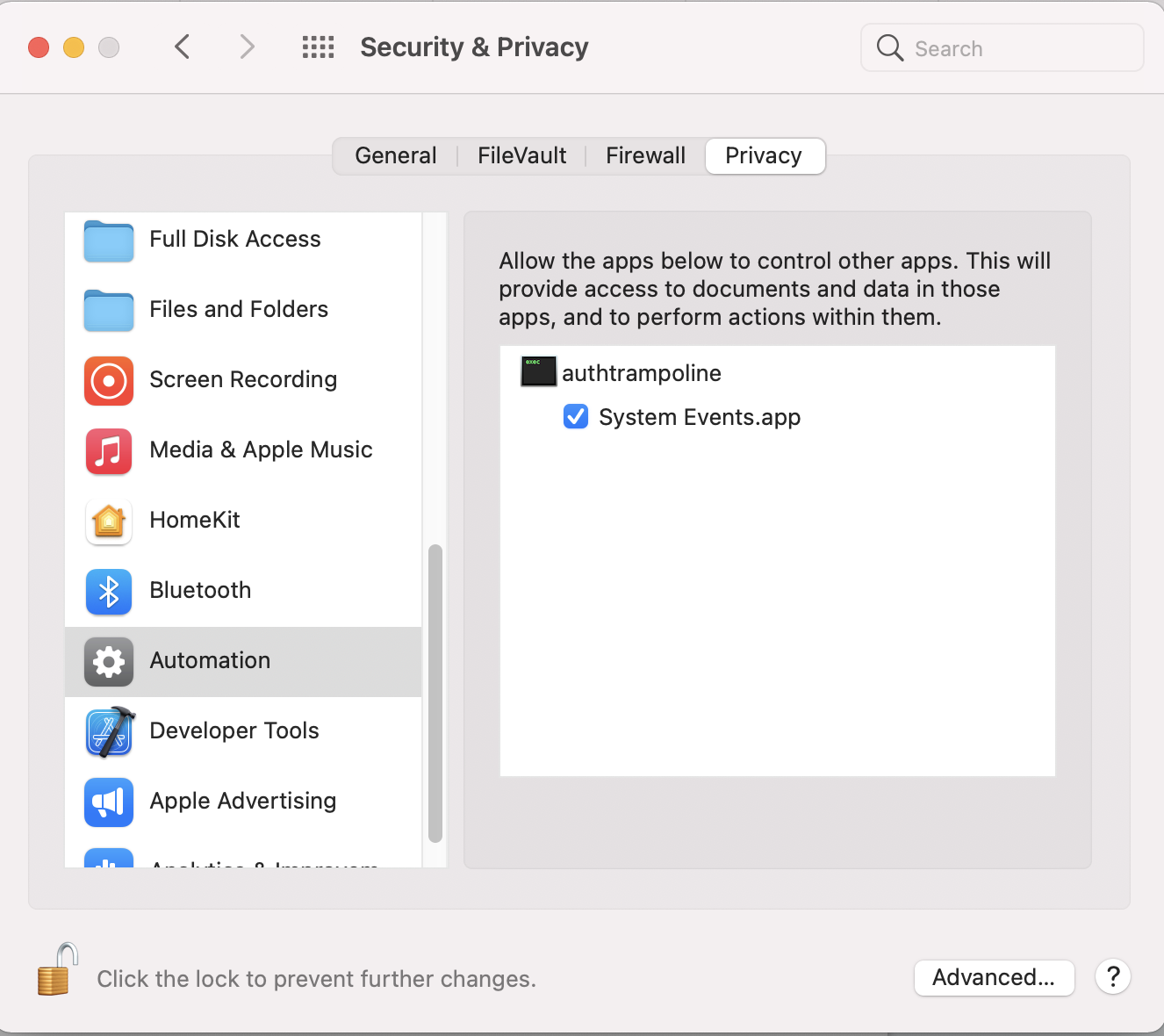 here. Mine shows that it last was run today; my security settings do not list authtrampoline under 'Automation.' I'd recommend unchecking the 'System Events.app box. Restart and see how things run. No harm checking.