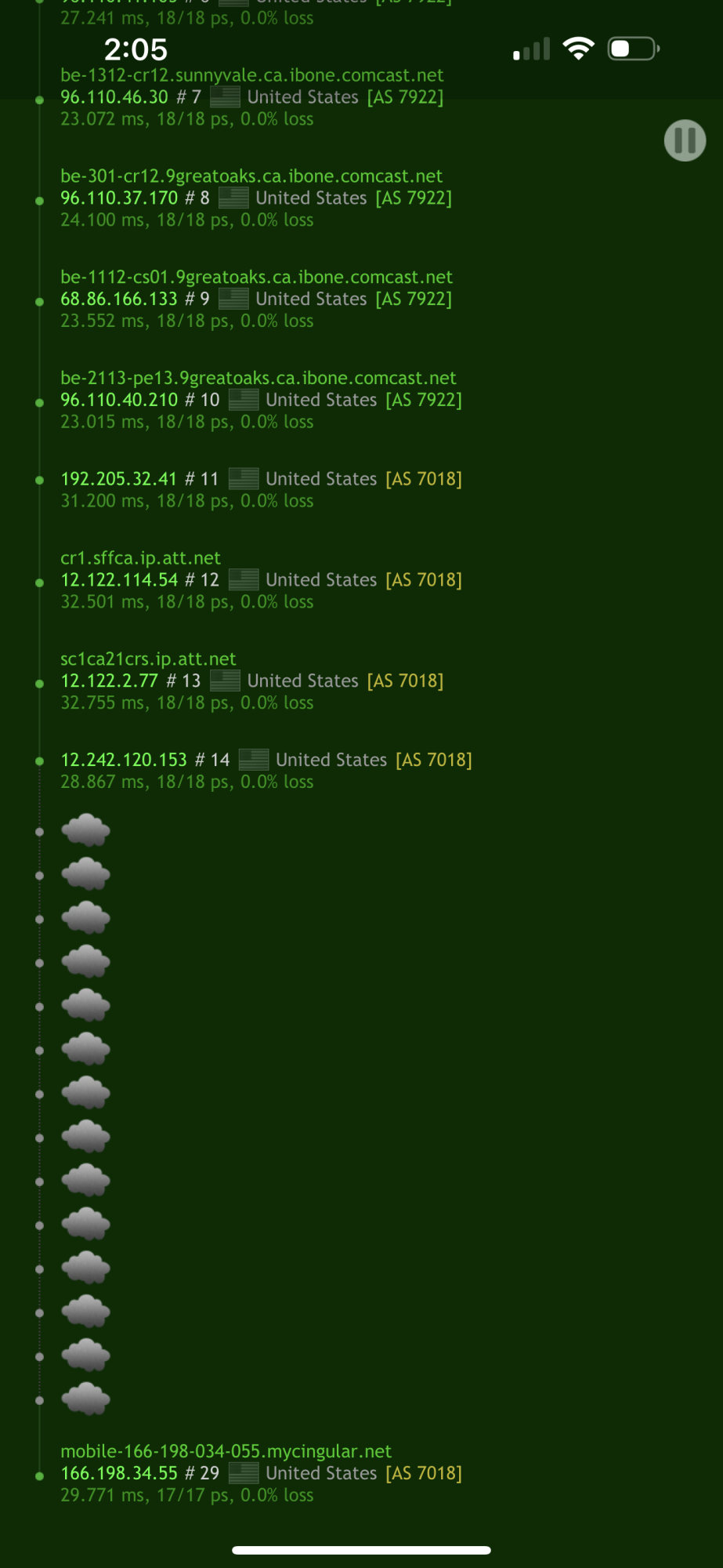 And my final question when you run a traceroute to my IP 7 out of 10 times it does not reach the final destination being me. I ran a traceroute from “whatsmyip.org” using their server and I’ll include the screenshot on this post. I’ve also run the traceroute using Wi-Fi to my cellular IP and same occurs or I get significant packet loss in numerous spots along the route. Significant meaning upwards of 80-90%??