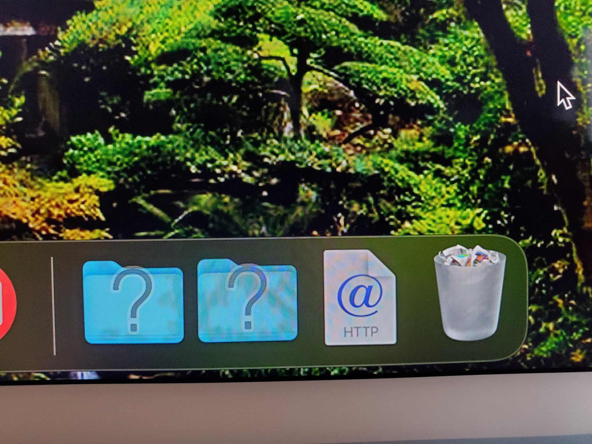 If you have an exernal drive, then drag a folder from that drive into the dock -- then eject that drive, the folder remains, but can't open when the external drive is not mounted. Any possibilities there?