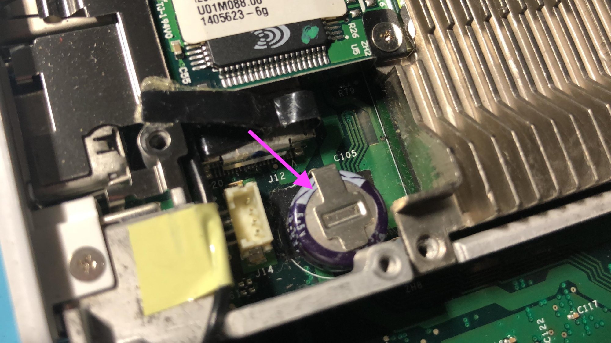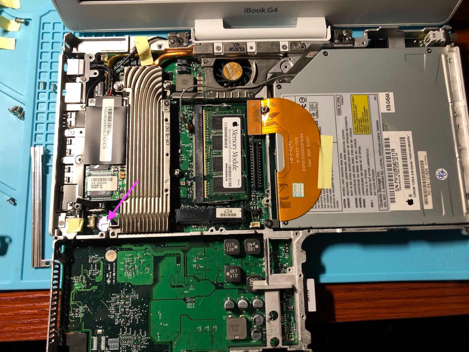 I've disassembled a 1 GHz 12 Inch iBook G4 from 2004. I notice something that looks like a PRAM or CMOS battery. Can someone please tell me what this is and what the proper term for it is? If it is a battery, I'm having difficultly finding a replacement for it. It looks like its soldered on.