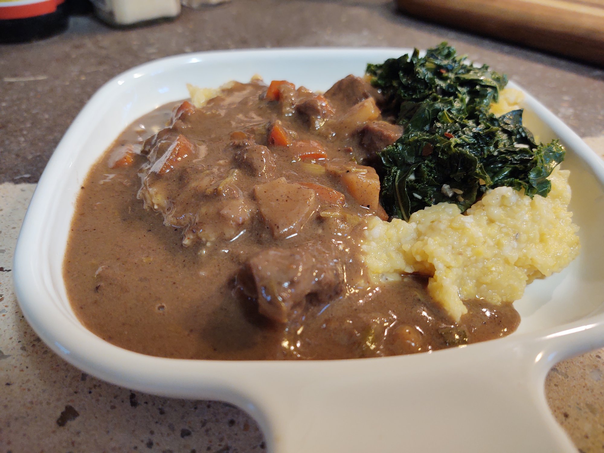 Grits, Greens and Venison Gravy. Grits via Weisenberger Mill, greens via Local grower and local venison, Garam Masala was added to the gravy, greens had a good dose of fish sauce.