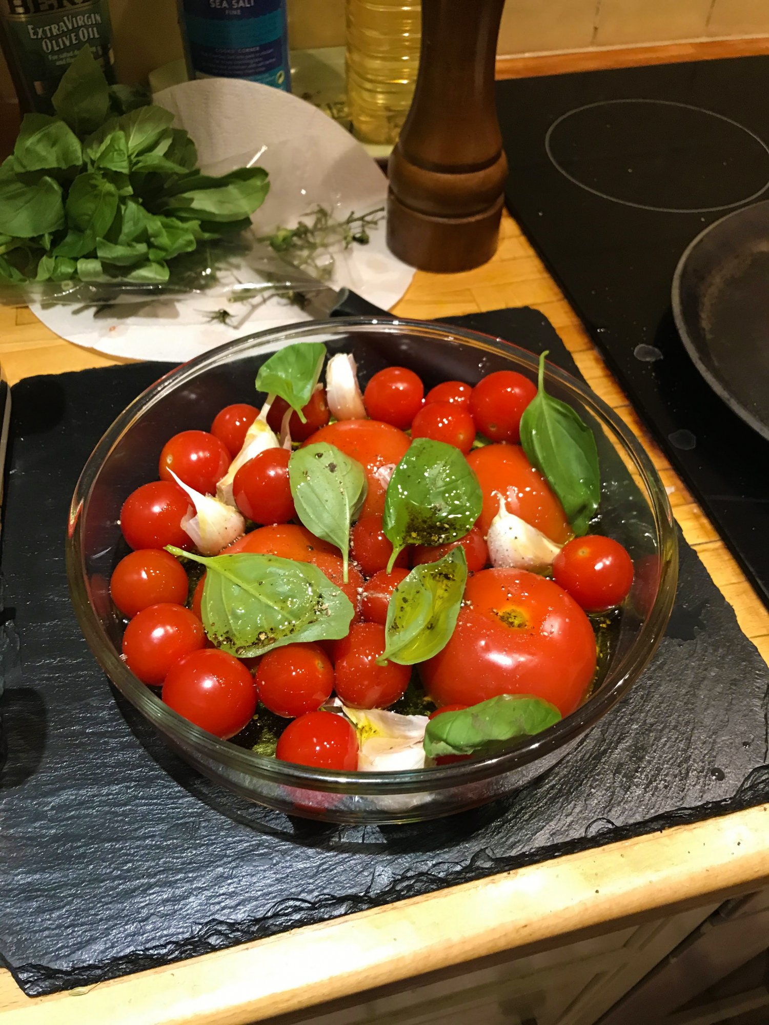 Just tossed tomatoes, basil, garlic, salt, pepper, chilli flakes & olive oil together into the oven at 450°F for about 45-50 minutes.