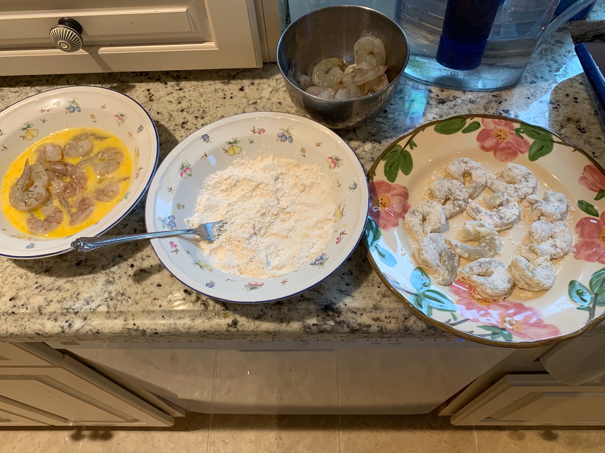 Battered shrimp In egg, flour, then sautéed in butter and wine along with leftovers, sweet potatoe casserole and chicken liver stuffing.