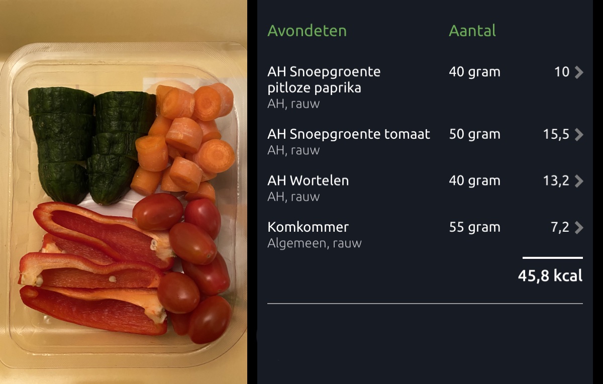 My daily diner consists of raw vegetables, today's example is below (yes, with the calories !).