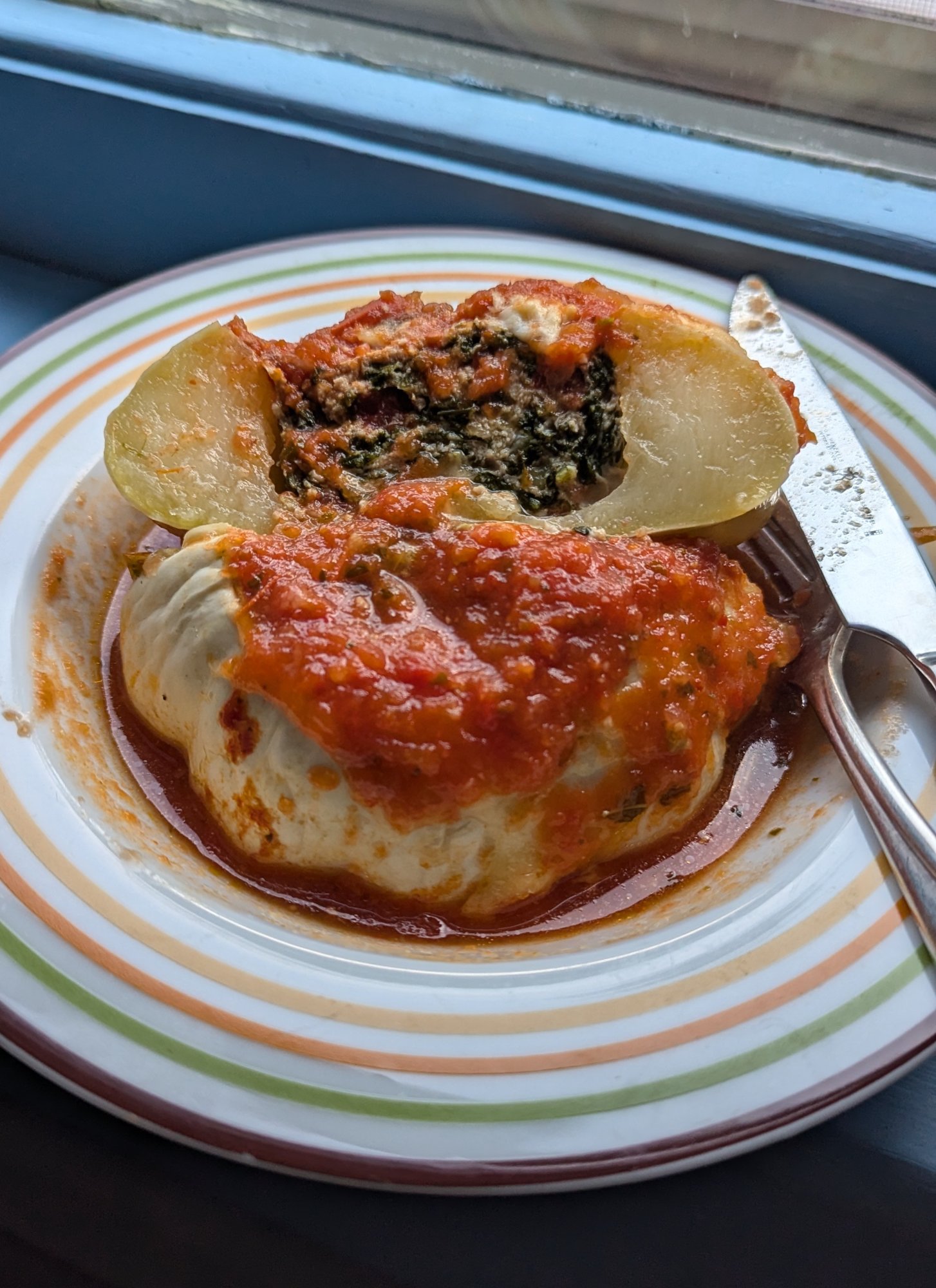 Your own home grown tomatoes and then cooked down for three hours?Tonight was our own patty pan squash with spinach, ground turkey and cheese, baked. The tomato sauce is made with our own grown tomatoes and then cooked down for about 3 hrs.