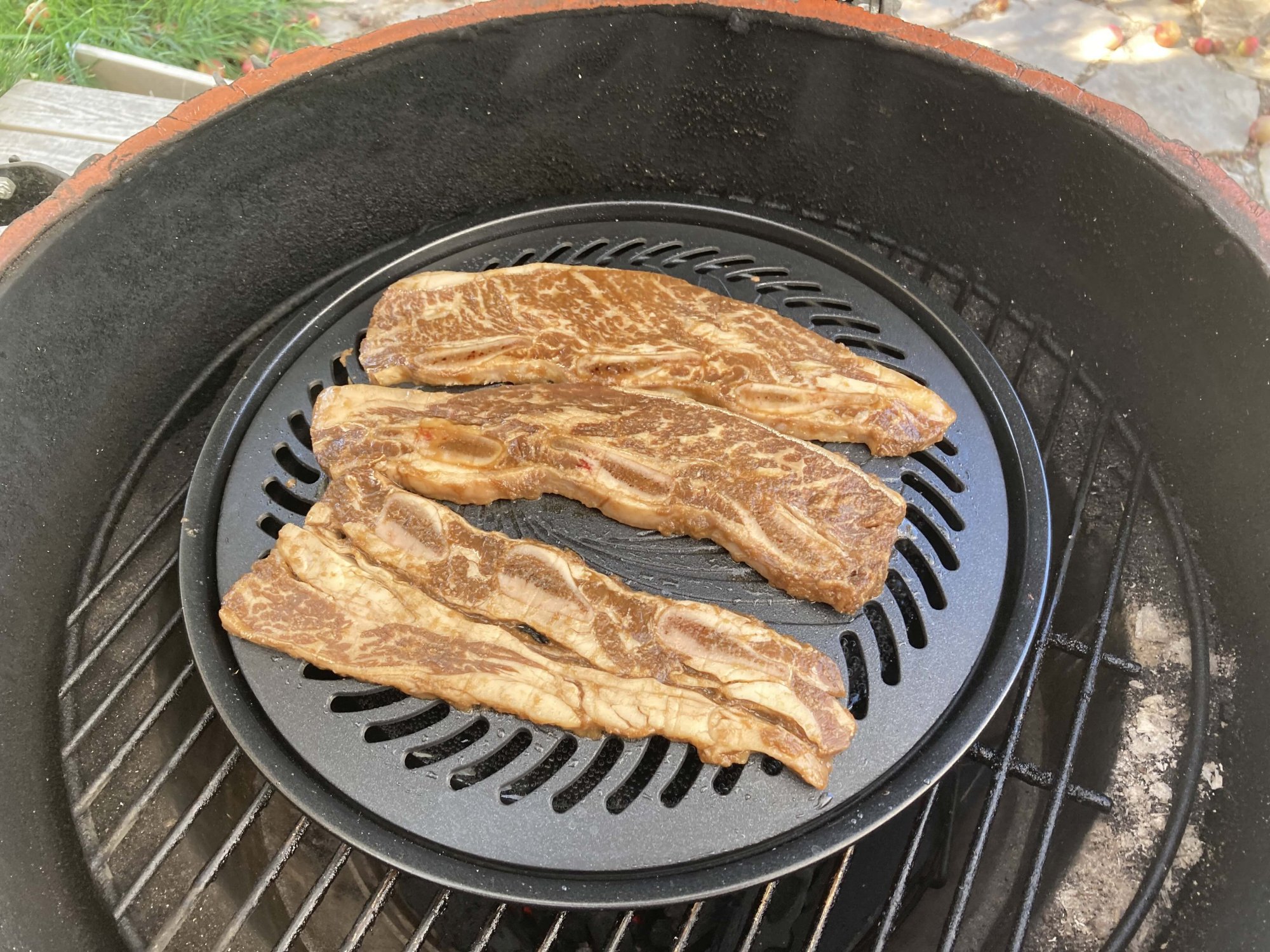 I made Kalbi, Korean flanken-cut beef ribs, marinated overnight with garlic, ginger, scallion bottoms, soy, shao-xing wine, rice vinegar, turbinado sugar, half an Asian pear (this tenderizes the beef) and a few drops of toasted sesame oil. I got the dome grill and my kamado cooker up to 400º, but as soon as I added water to the bottom tray it cooled everything down, so I didn't get the char I wanted. I went to Plan B, slid the dome to one side, then put the ribs on the grate to get some grill marks: