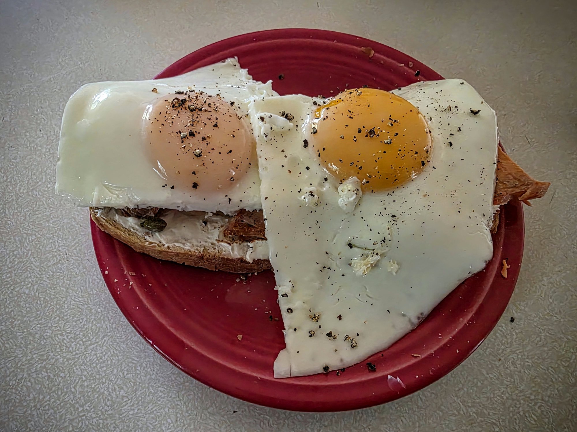 Leftover smoked sockeye salmon on toasted sourdough bread with cream cheese, capers and gently poached (in an old school Calphalon Commercial anodized aluminum pan) farm fresh eggs slid on top.