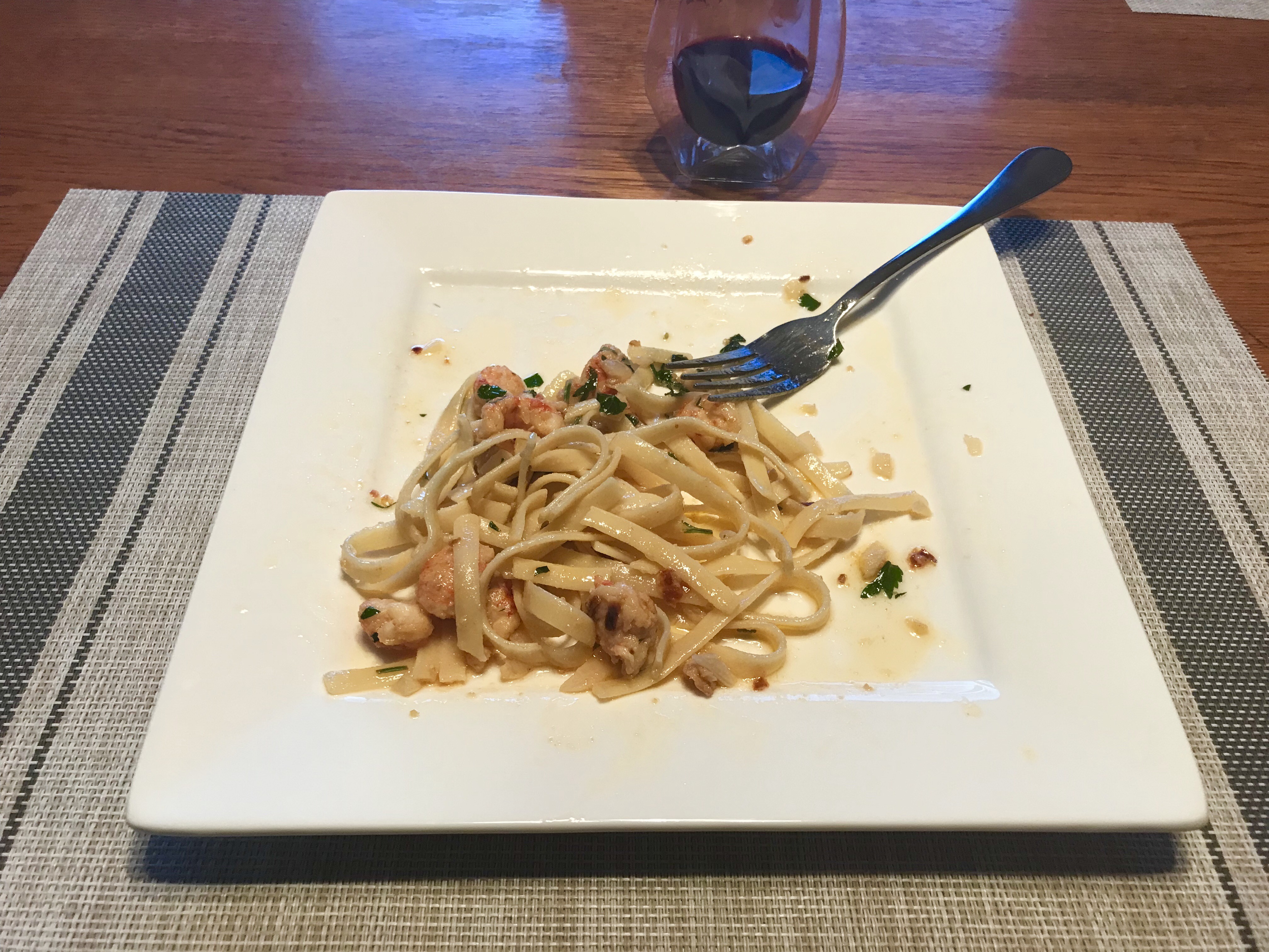 Your wine glass looks angular but also not. Pasta looks great. Fresh squat lobster or frozen? I don't think I've ever seen either.
