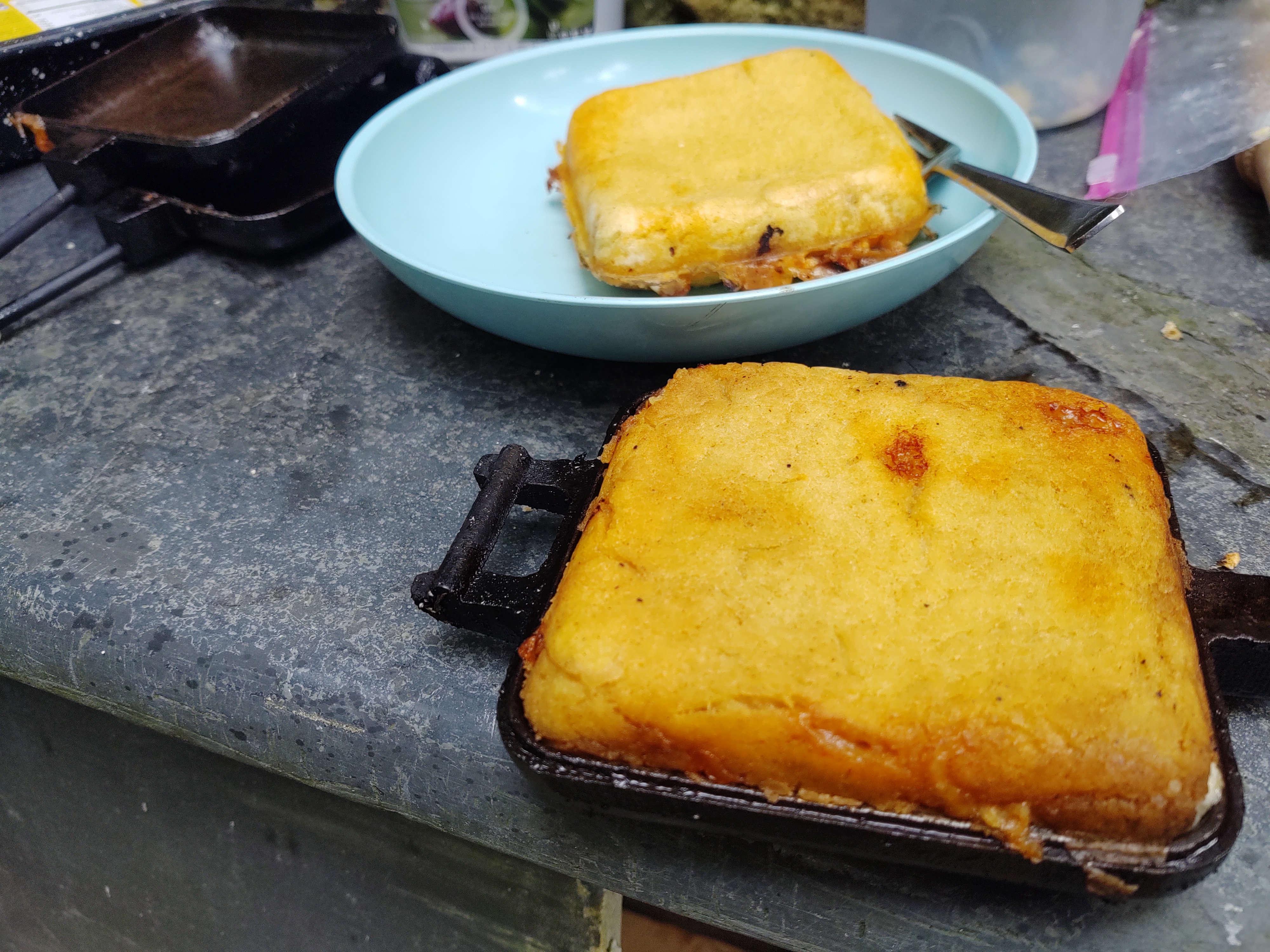Corn Masa mountain pies with taco meat filling which was a mixture of ground beef and chorizo and chopped up garden picked tomatoes, onions, peppers and then some spices and Monterey Jack cheese.