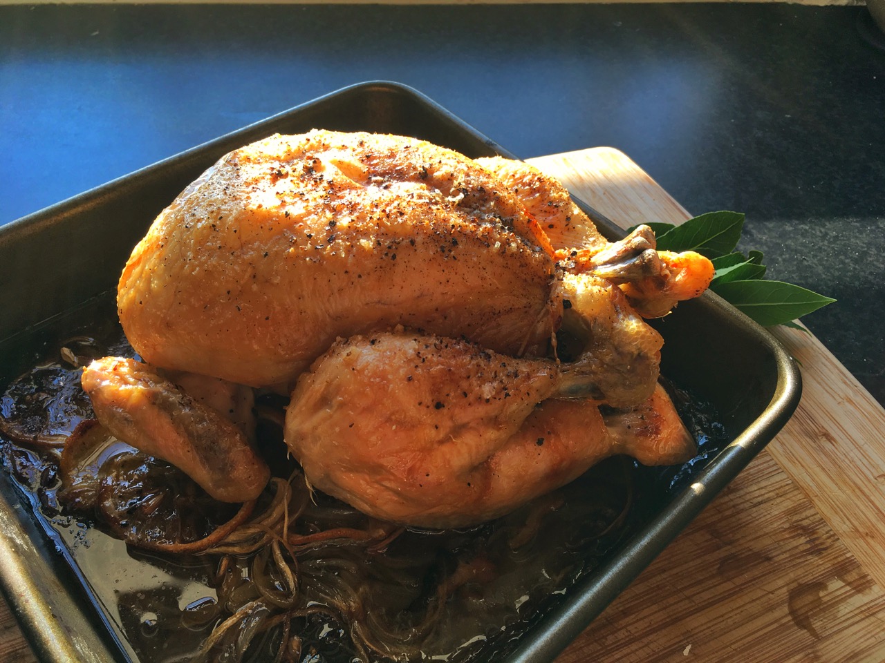 First, roast a decent sized organic chicken on a bed of thinly sliced onion and fennel.