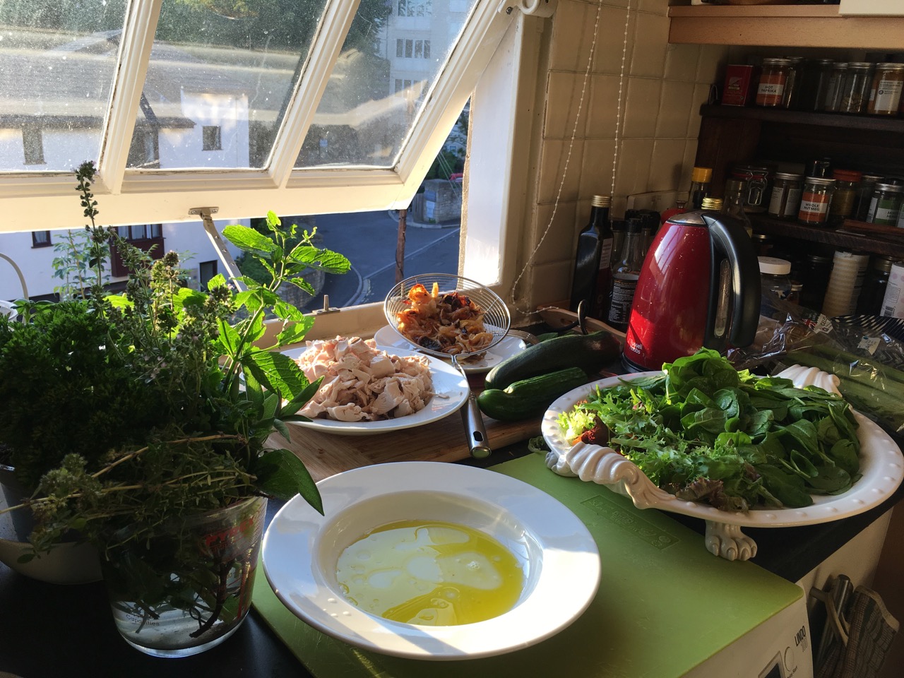 Tear and slice a whole range of leaves and herbs — and a fat zucchini thinly pared into strips.