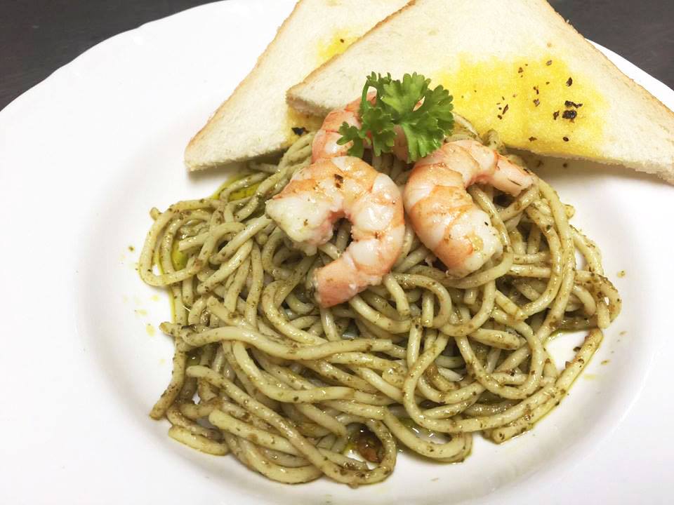 Pesto pasta with shrimp and garlic bread.