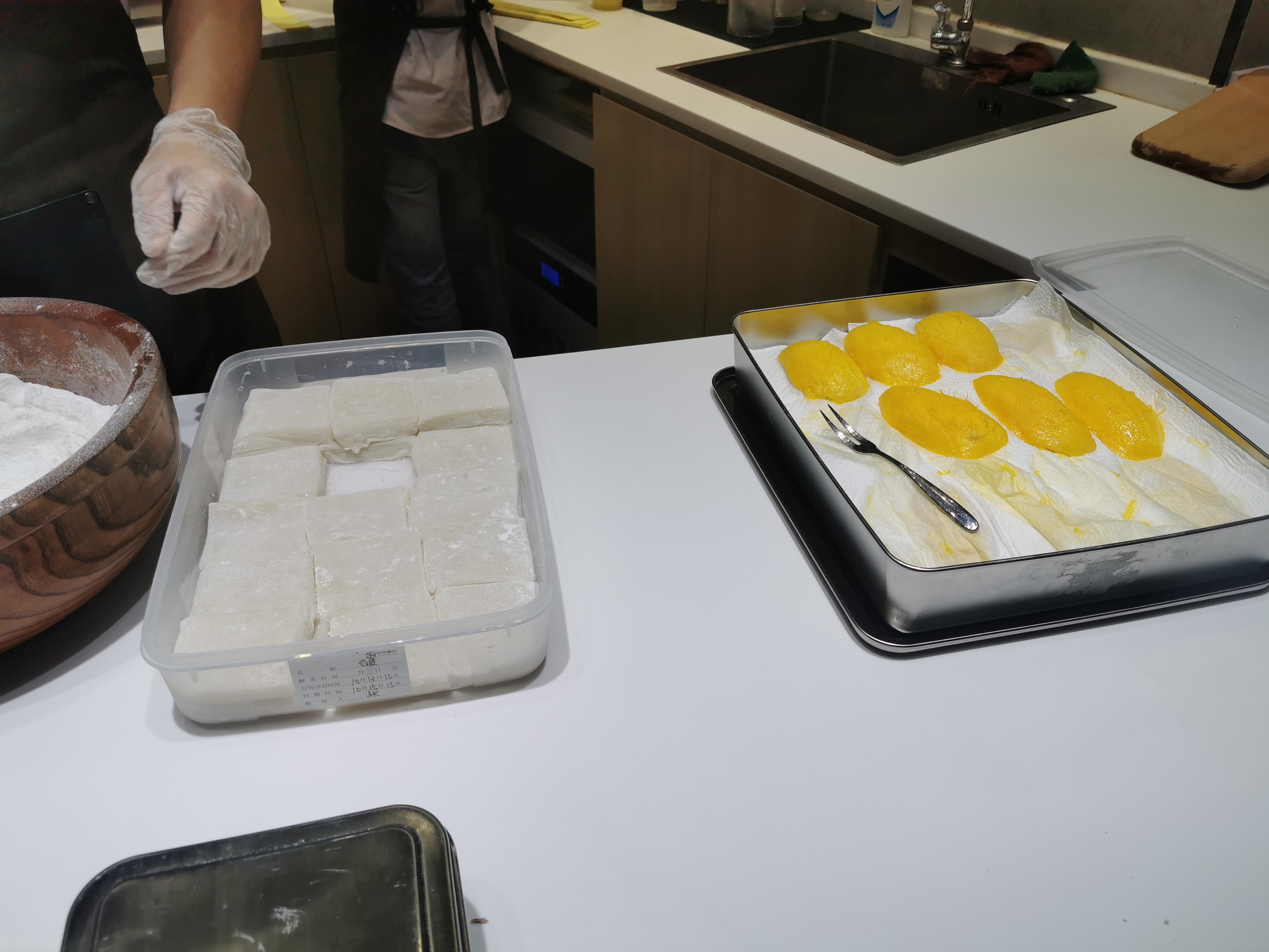 This is mango mochi being made. Fresh mango slice in mochi
