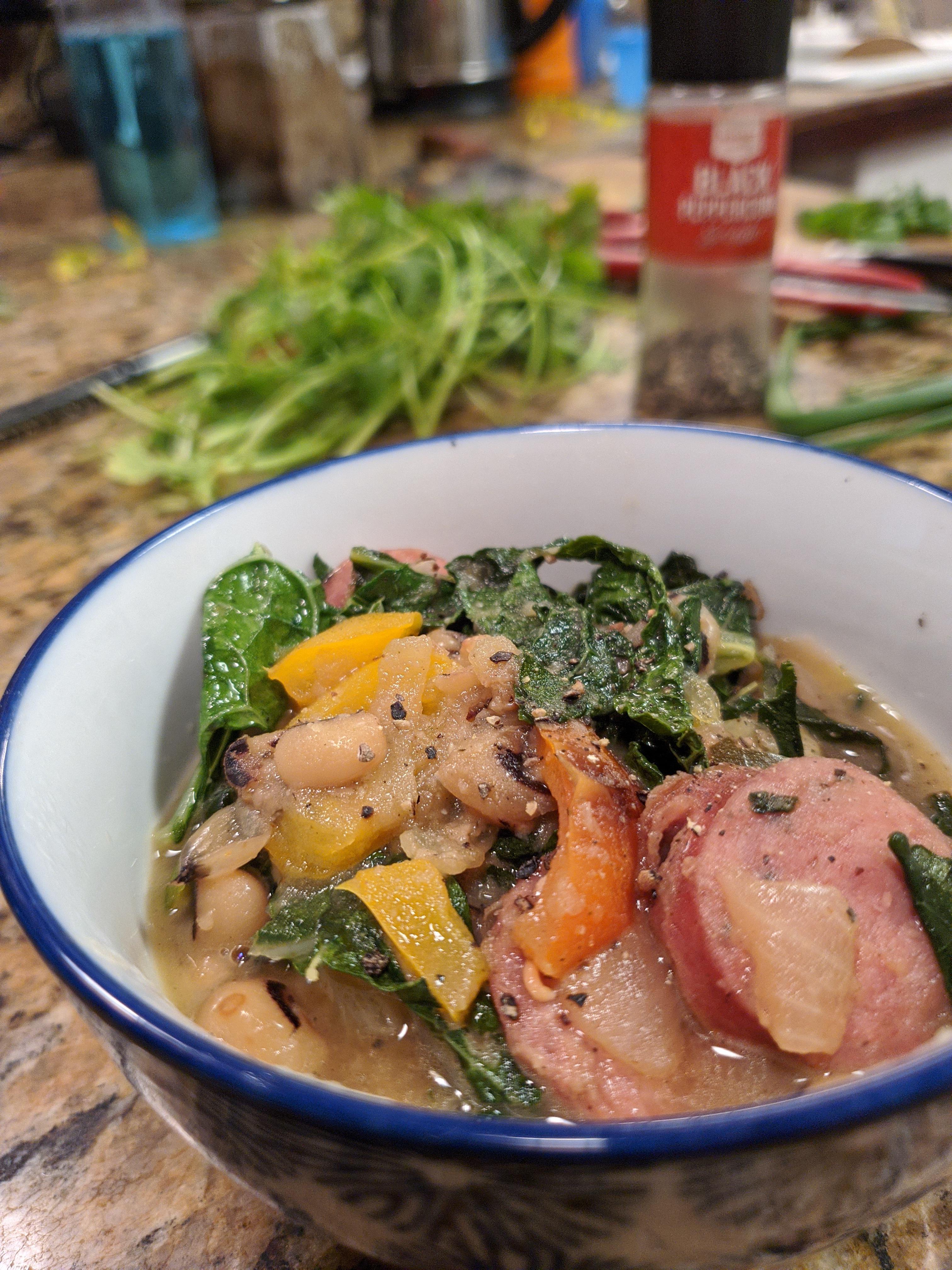 Next, chopped vegetables - carrots, onions and long, sweet, red peppers - roughly chopped - were sautéed in olive oil, to which butter was added, and to which a small dish of minced garlic (a large head) was eventually added. Sea salt, freshly ground black pepper, and a little organic sugar were also added at this stage.