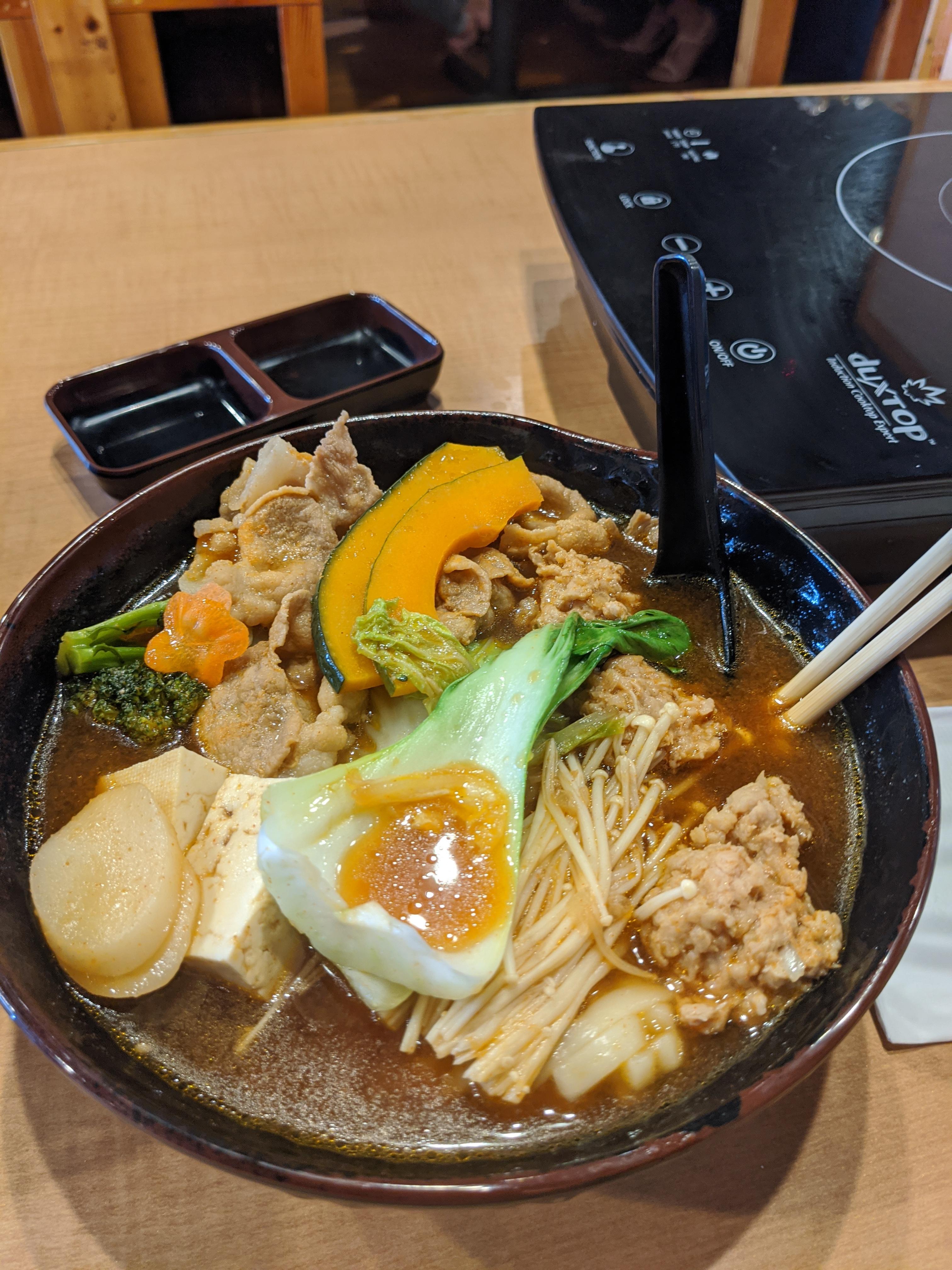 Today is a bit cold and rainy so I did the udon set meal at the hot pot place. Lots of veggies and tasty yuzu meatballs in a gochujang citrus broth.