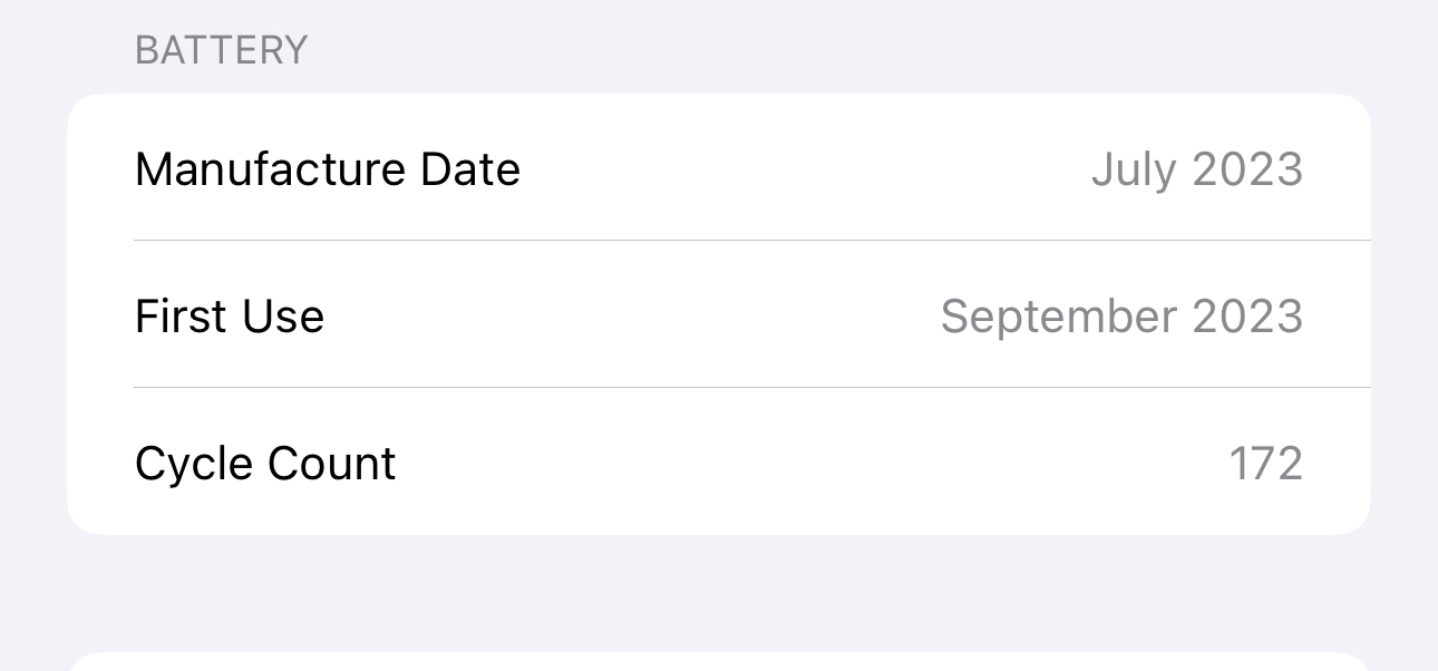 172 cycles here on a launch day 15 Pro Max. Somehow still have 100% health