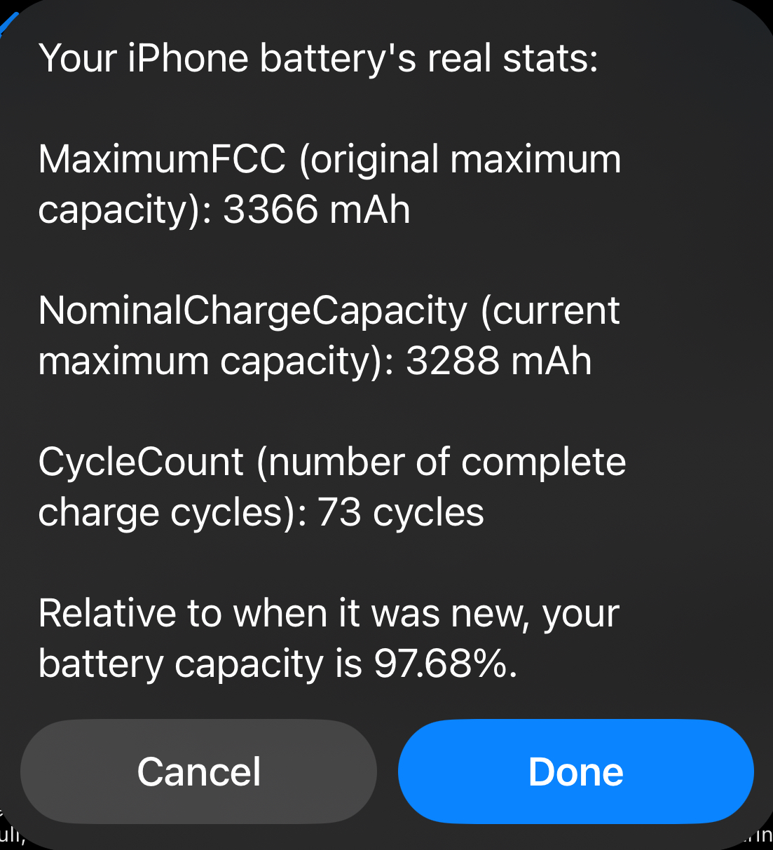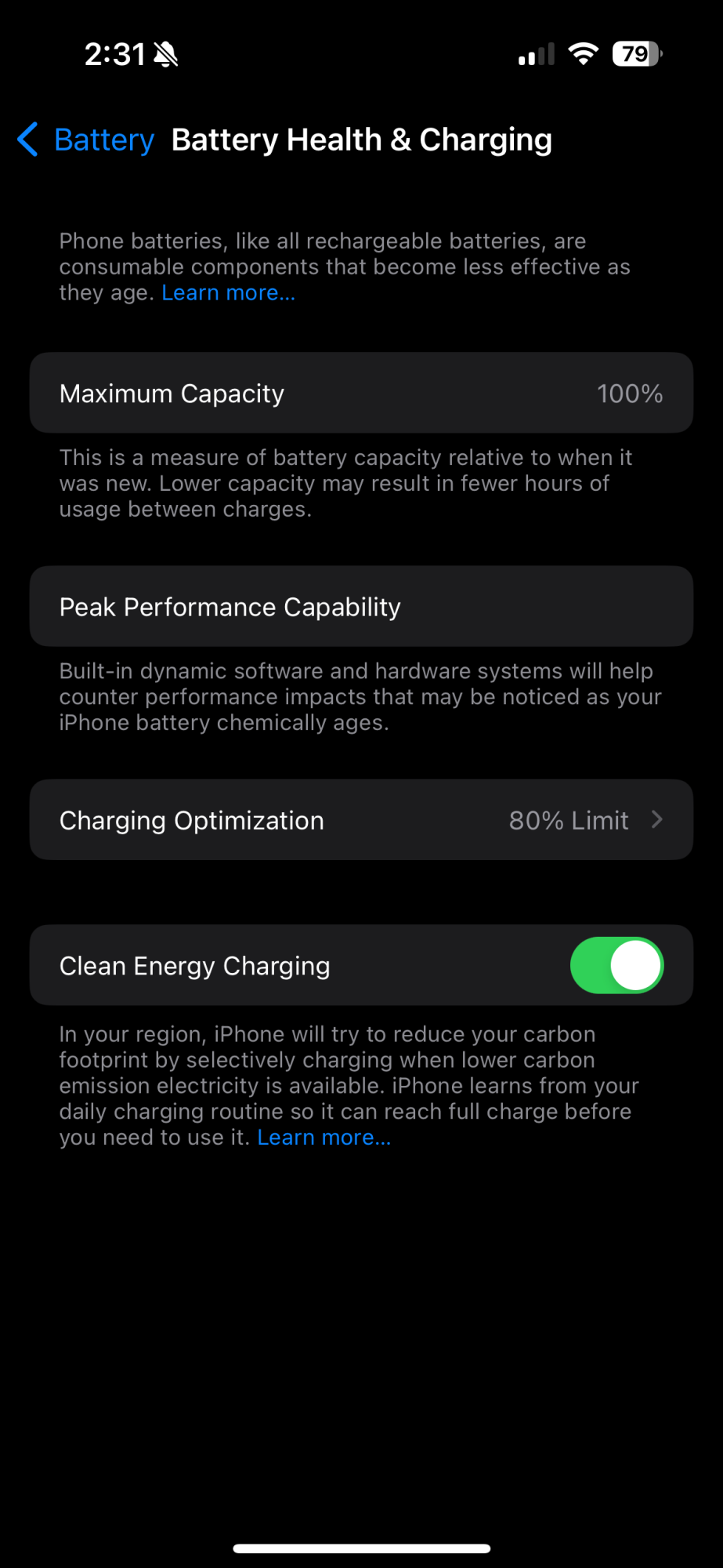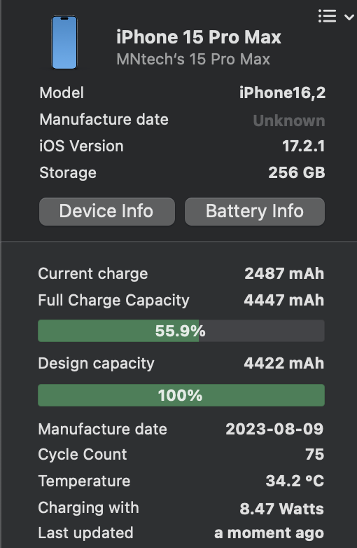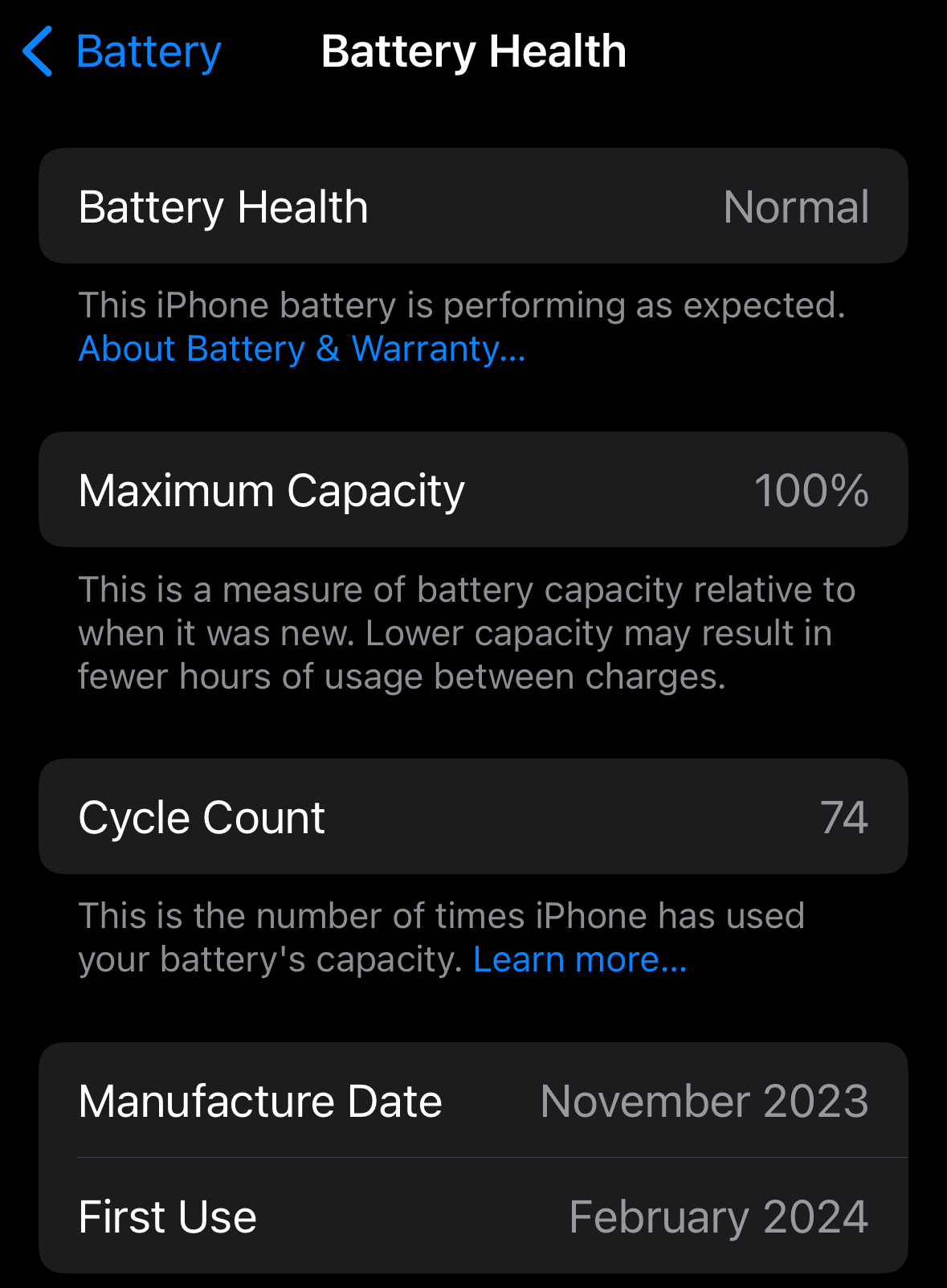 Interesting here is mine I have updated all the updates till couple weeks ago was 100 percent health but now this with 17.5.1 iOS: Interesting here is mine I have updated all the updates till couple weeks ago was 100 percent health but now this with 17.5.1 iOS below . However I tend to use my iPad lot more so most days my 15PM is around 70-75% charged so i am probably using 20-30 percent a day of charge on battery. So roughly 230 days of charging and it shows 114 cycles. I have enough days though away from iPad i use more so it appears I am getting about 2 days per cycle. I use optimized but full 100 percent (finishing from 80 percent at 8 Pm to 100 percent near 4 am next day.:15 Pro