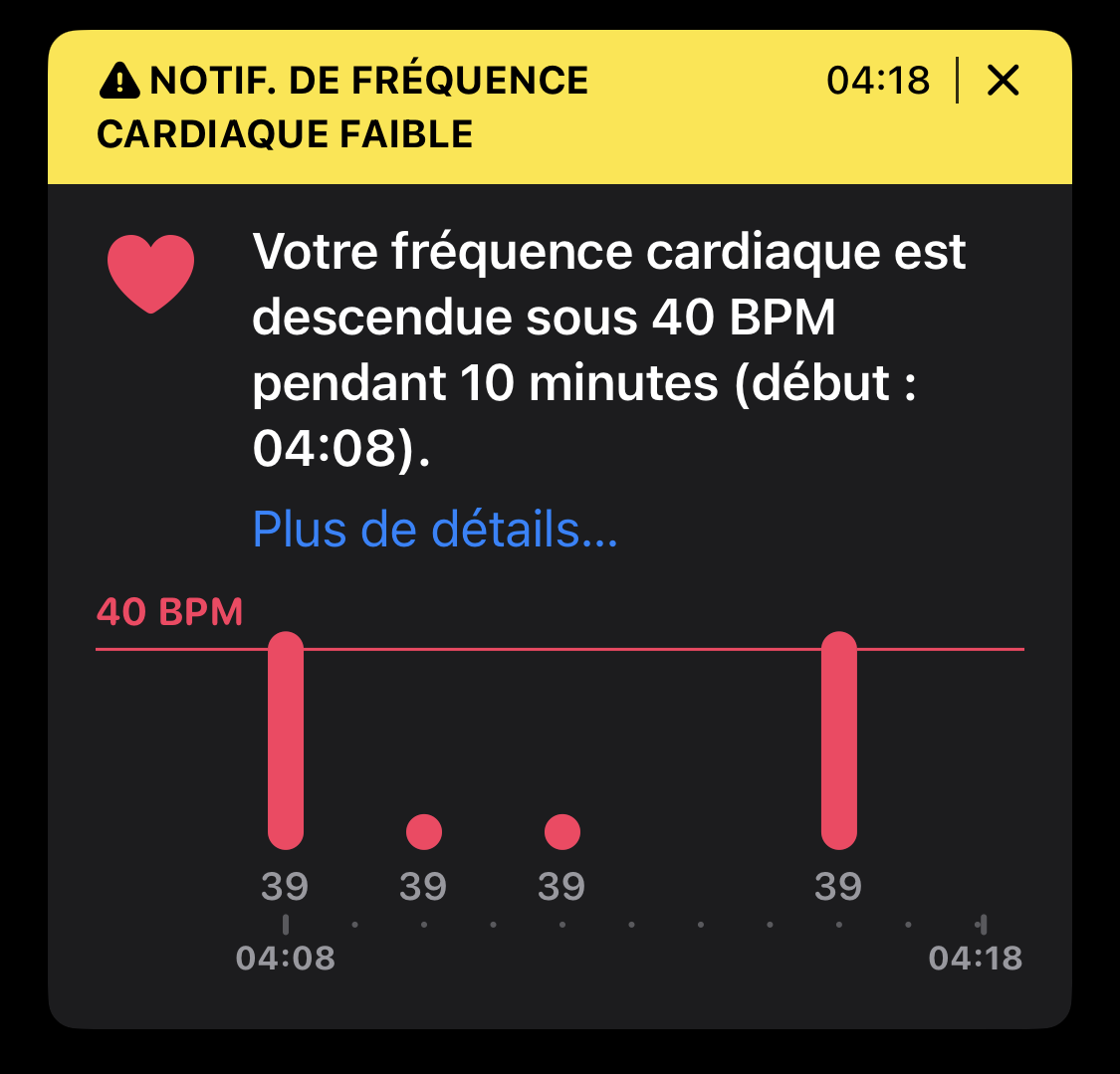 Hi, I would like to know what’s the lowest heart rates have the community of Mac rumors. Last week, my watch alert me to passed under 40bpm while sleeping