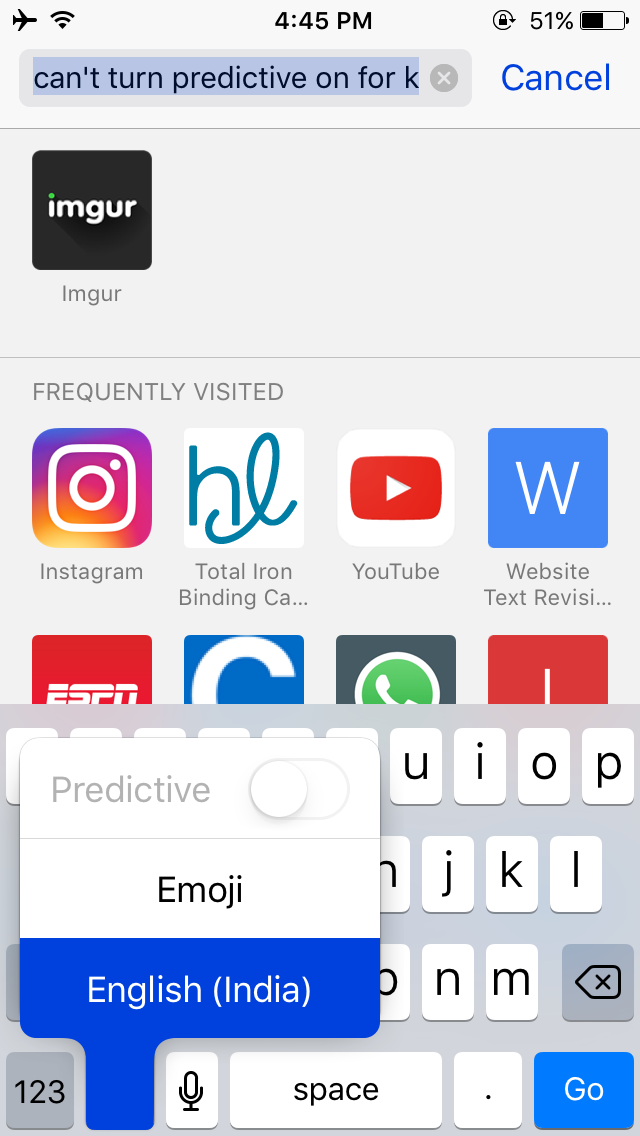 When I try to use stock keyboard for typing anything on safari browser's address tab, the predictive text is off.