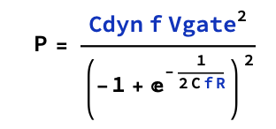 And, it turns out, f and V aren't fully independent. Why? Because the way a transistor works in a digital circuit is essentially as a switch, so you can think of there being a threshold voltage on the gate, less than the supply voltage, that's necessary to turn it on. Because it's a capacitor, and there's resistance leading into that capacitor the voltage on the capacitor is described by a differential equation and the time it takes to reach a particular gate voltage solves to: