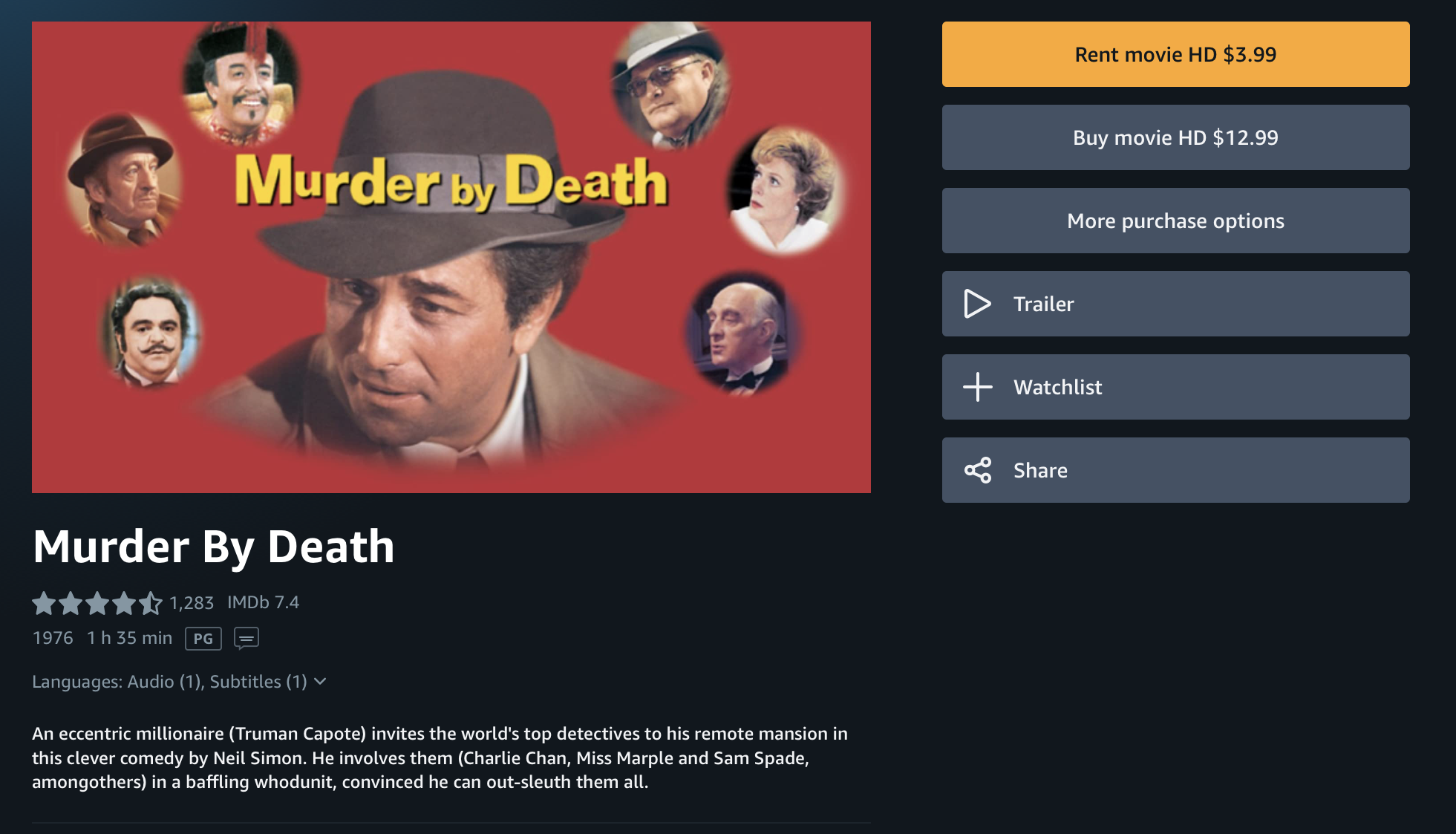I love “Murder By Death”! So many quotable lines (“Say your goddam pronouns!”) (“I’ll get it later ma’am, when I park the car.”) (“I hope he knows how to stop that thing.”) 😄😄😄