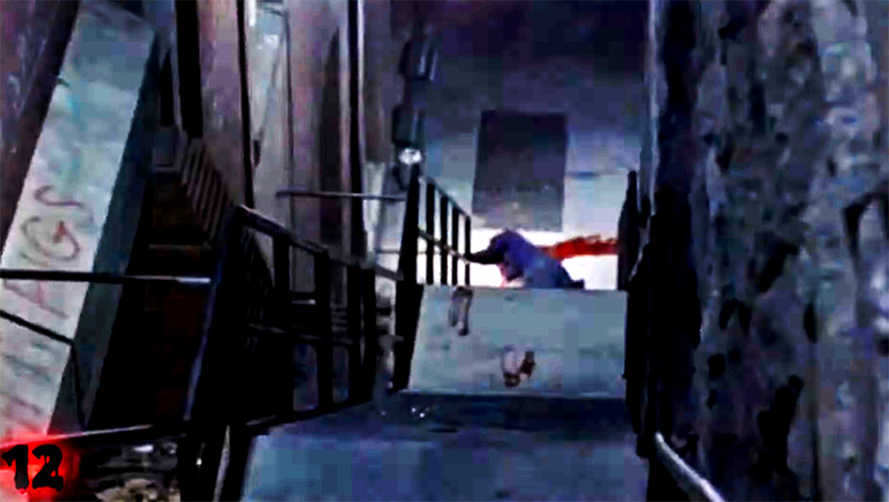 In honor of director William Friedkin, who died today, I present a frame from The Exorcist, when Father Damien Karras has killed himself by jumping out the window and falling down a dark flight of stairs, and a photo of me posing dead at the bottom of the same stairs where the scene was filmed.