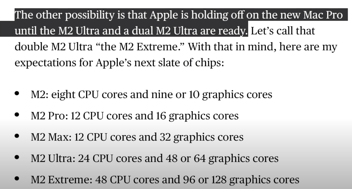 Even going from TSMC N5 to N3 and taking only maximum power reduction benefits is only a -30% reduction in power. So about 160-170+ W and that reduction .... 112-119 W. That still wouldn't happen. The M2 either has N5P or N4/N4P which are small fractions of that reduction. Not going to happen at M2. M2 may not even have a new Max let alone a new Ultra. M2 and M2 Pro ( with some narrow tweaks. a couple of GPU and/or E cores tossed in. And an A-series , small scale ProRes tossed into the M2. ). The will be an incrementally faster M2/M3 Max along the way in a year or two that will probably suffice.