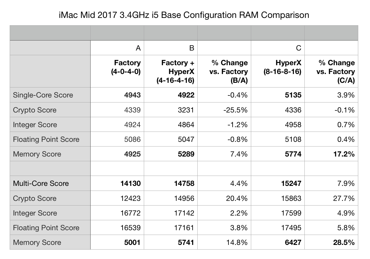 The results from 0-16-0-16 are the same as 8-16-8-16; therefore, I think it's safe to assume the increase is due to the type of RAM rather than the increase in capacity. For example, the Memory Copy speed (19.1GB/s vs. 12.1GB/s) and Memory Bandwidth (29.9GB/s vs. 22.9GB/s) are much higher with the HyperX RAM vs. factory.