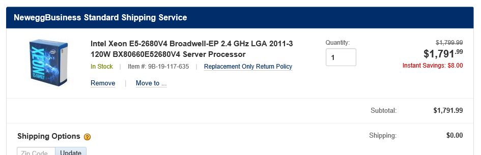 https://ark.intel.com/products/91754/Intel-Xeon-Processor-E5-2680-v4-35M-Cache-2_40-GHzThe current "premium" E5, the E5-2680v4 (and im not going to include exotic OEM cpus) sells for close to $3500... for just the CPU.