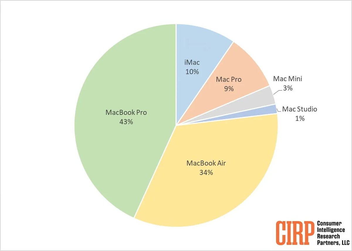 The CIRP numbers are sketchy and frequently questioned, but it's the only hint we have at market share of different Mac models. Apple keeps any real information secret. The report came out when the Mac Pro was still on Intel.Just curious, do you know what time period this graph represents? It's interesting to see the iMac selling 3x as much as the Mac mini, yet the mini is the one seeing more updates. And it's mind-blowing that the Mac Pro would outsell it by a similar amount.