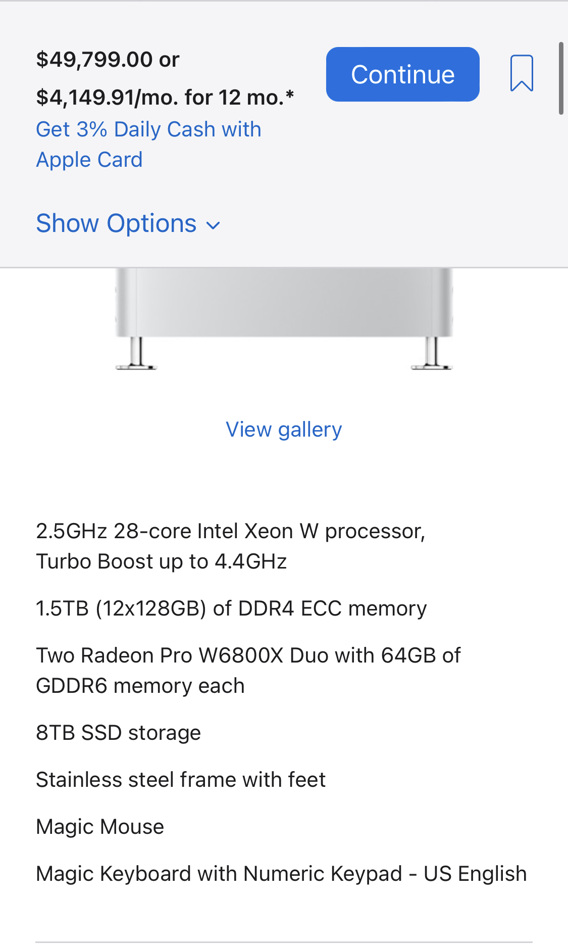 I doubt many people buy RAM from Apple since their prices are so inflated. I know I didn't.Multiply that by 4 and you’re getting closer… this is without the wheels or afterburner card because I’m not sure that counts as maxing out