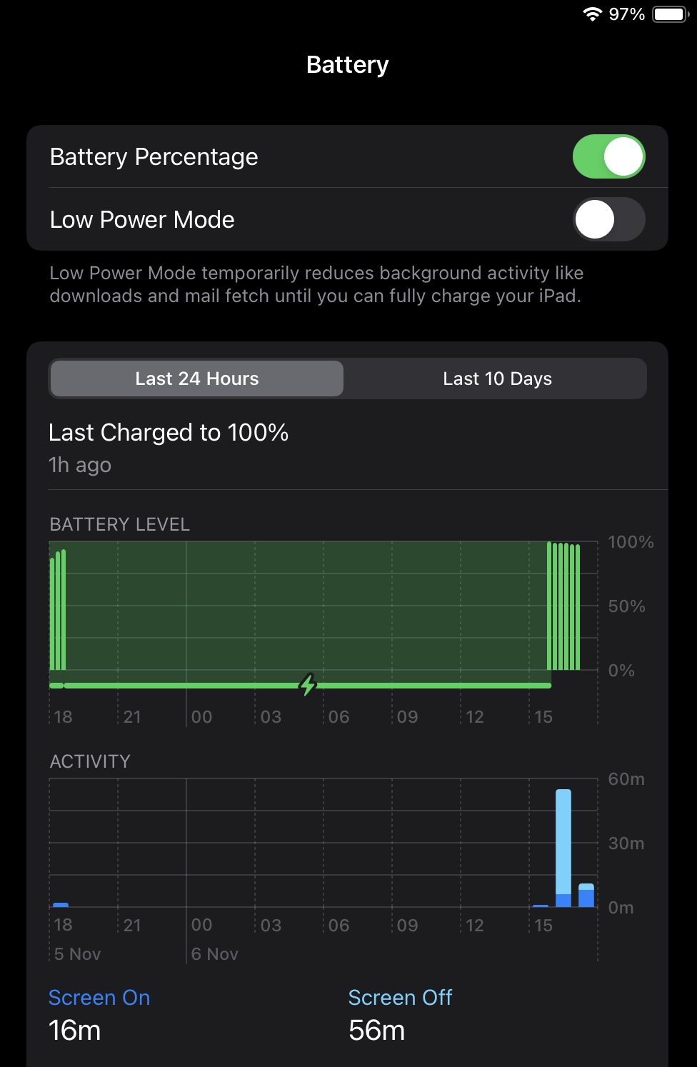 I took my iPad (9th Gen) off charge and turned off around 1840 yesterday evening, with 95% charge. When I turned it on this afternoon, just after 1500, I noticed the battery was at 100%.