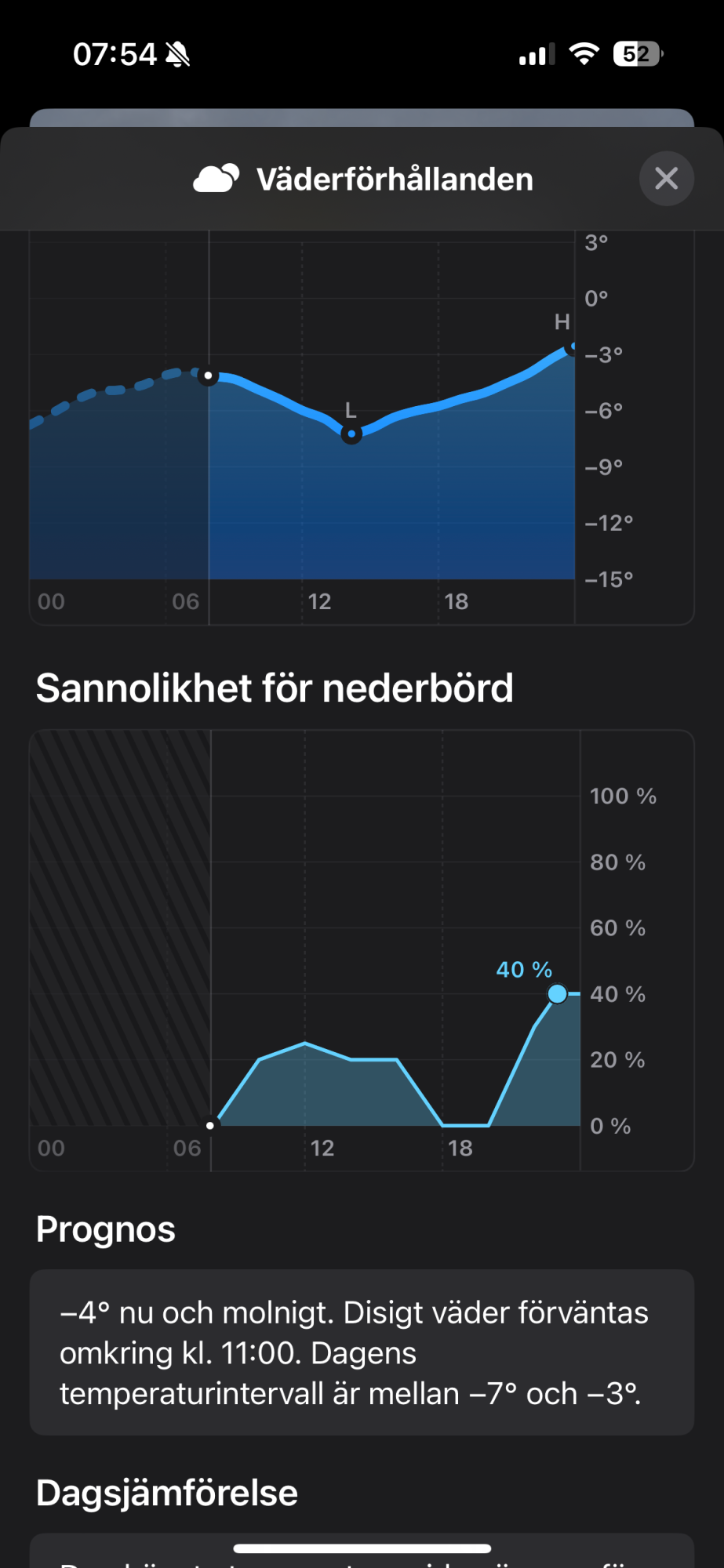 In both the iPhone apps I use, Apple’s Weather and Yr (which is generally the best) predicted snow more or less all day, while my watch though the chance/risk was 0% all day…