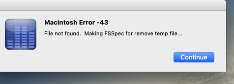 Sudden recurring issue when closing a certain legacy audio application. When I choose Quit, I now consistently get the following Sequence of dialogue box messages: First, Error-43 message as shown... and then upon hitting Continue..sometimes a couple or few times required - the next dialogue message as shown. After hitting Continue on Message Two, the app -eventually- will close. Any idea what's causing this. Running Onyx, Disk First Aid and trashing app's prefs, rebooting. zapping the PRAM - does not get clear this. I'm on Mojave, No other app presenting this issue. I am able to re-open the app subsequently. -Thanks!