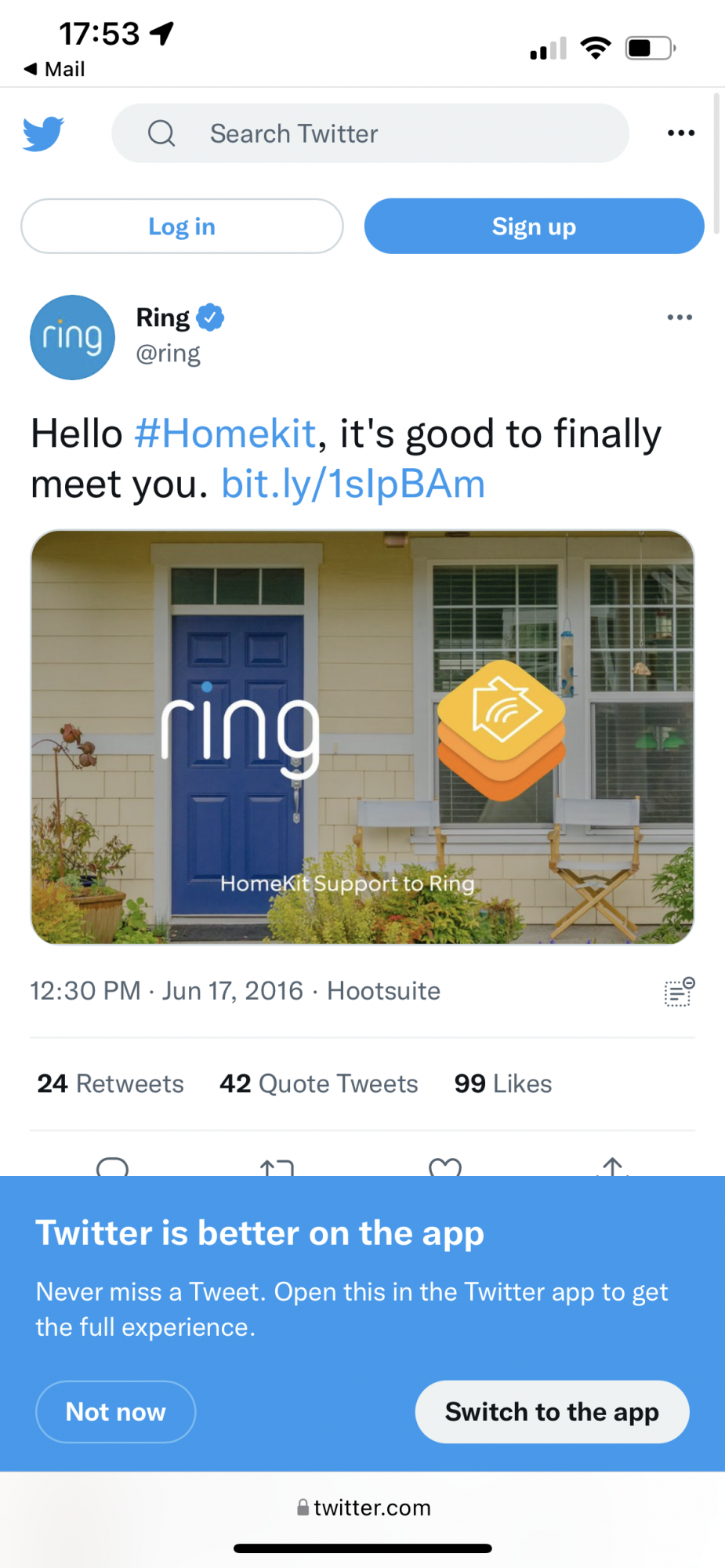 By the way, unless Matter changes anything, I think it safe to assume Ring will not becoming to HomeKit (Besides using HomeBridge). Check out the date of that Tweet lol. Little more than two years ago.