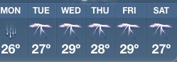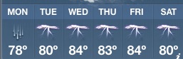 Those numbers all look foreign to me!What's on my mind this afternoon is yesterday. Specifically, cadging a ride with the guy who usually mows my lawn and who was heading into town for some shopping. I just wanted to hit up the ATM and do a little grocery shopping. Upon exiting his vehicle in my driveway I thought to hand him the money for the next mowing plus a little for his trouble, saying casually, "So you'll take this now and then just mow whenever you get a chance during the week, eh? Thanks for the ride into town." Then today I awoke to this forecast of weather: