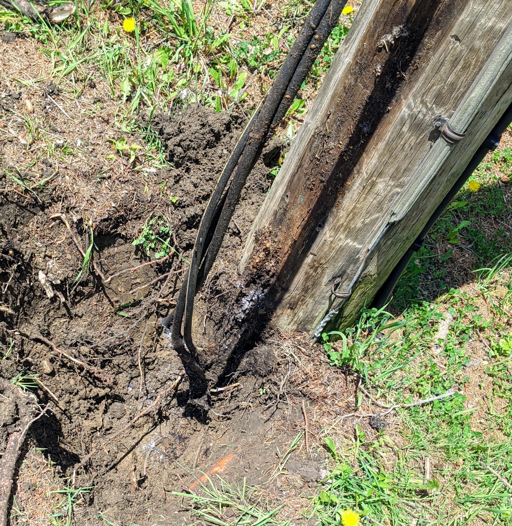 That crewman was not responsible for working on the underground part of their system and had to call someone else. Again, thankfully the weather and everything else here is calm and two other crewman arrived within 30 minutes. They dug up the ground at the base of the pole and located the problem.