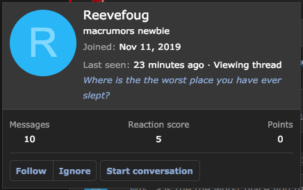 I avoid those kinds of questions here and elsewhere, seems like it's data mining.I've noticed that,https://forums.macrumors.com/thread...al-world.2246333/?post=28684734#post-28684734 too..... Nine different threads all asking questions which seem to be rather personal.... Why join a primarily tech - focused forum and only participate in the Community Discussion subforum?