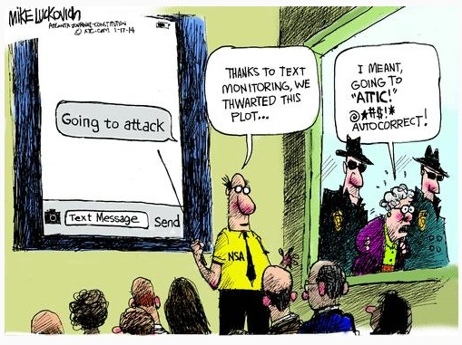 Wow, I really need a bright yellow shirt like that with "NSA" stitched on the right side. I already have the glasses and convertible laser pointer. I've even got a pocket protector in one of my desk drawers (not shown in picture, because it's a derogatory stereotype).And don't forget the side-takers on the matter of autocorrection.... I always thought it was just about levels of being embarrassed -- over my own typos or else over Apple's wacko decisions on my behalf. But at least far I've managed to escape getting busted for what Apple thought I meant.