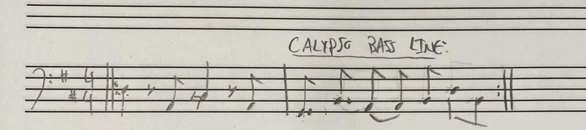 groove will make people want to dance to it. Take this cool calypso bass line (I’ve been practicing this one for the show). Also practicing palm muting on this, cause it sounds WAY better in this case. It just works so well cause it has a nice groove. I just wrote out the line isolated from the rest of the arrangement to make it less confusing. (Realized I could've beamed the dotted eighth notes, but whatever, it's fine for the sake of an example).