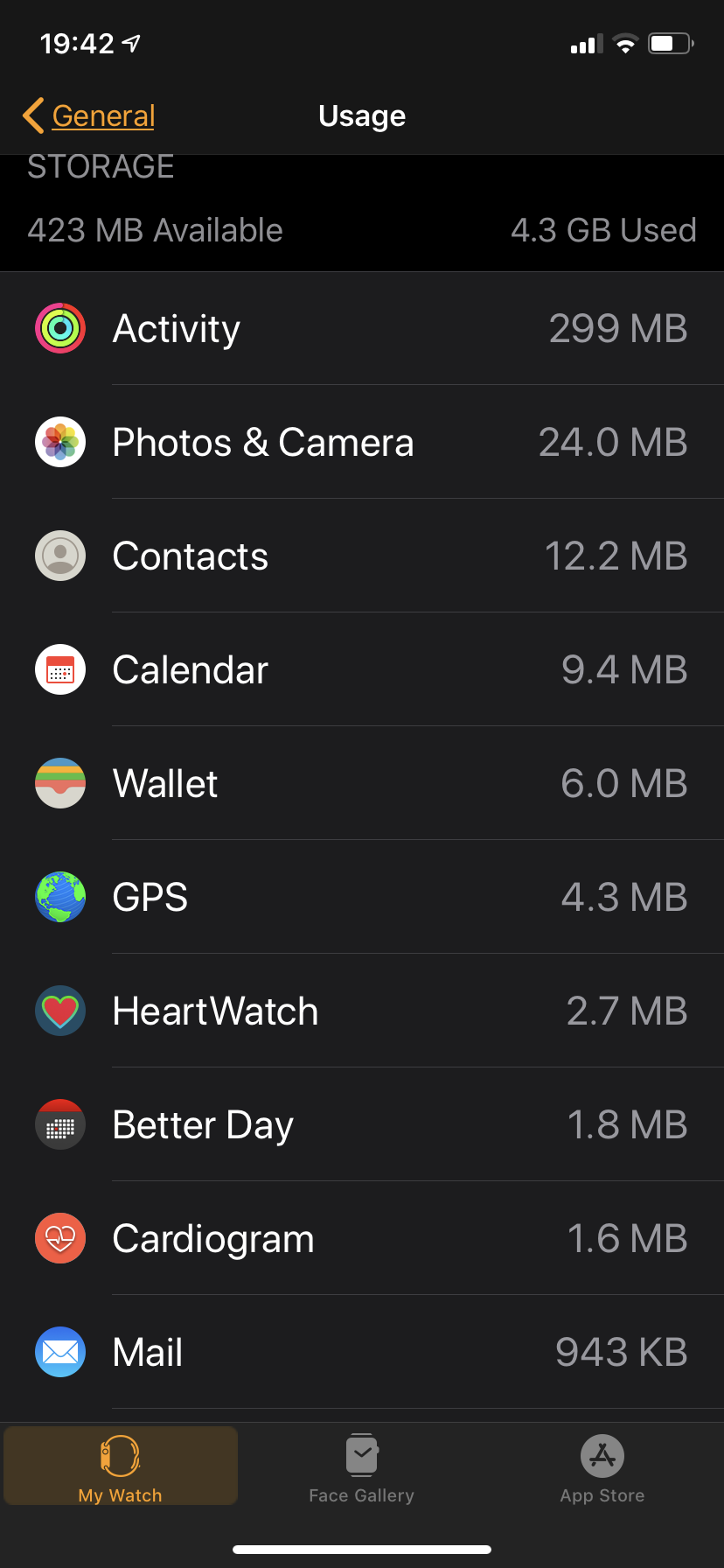 On my Apple Watch I have zero songs, 16 photos and 4 apps installed. I have no Podcasts or Audio Books.