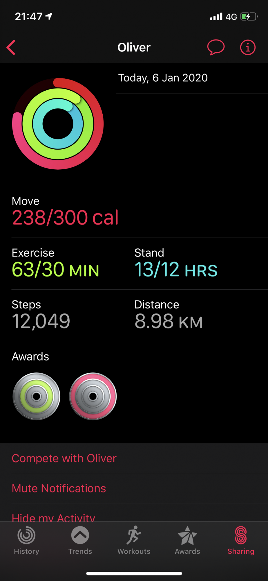 I've hit it 60 straight days. (My 90-day average is 1,478 according to the Trends tab in iOS 13.) I mostly run, but I also row (indoors) a couple of times per week and bike when I need a day off from running.