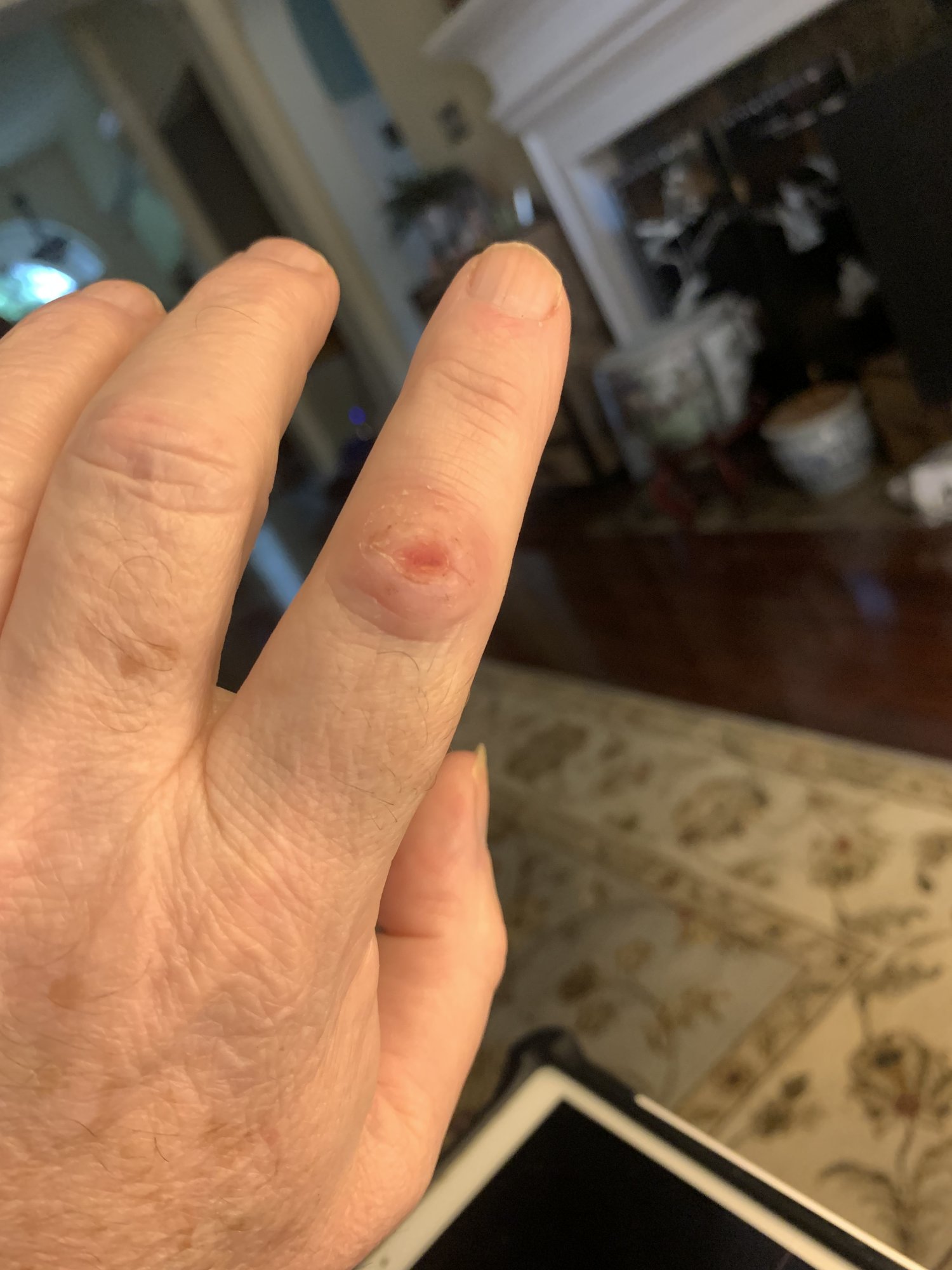 Almost 2 1/2 months later consistently using Compound W, it’s hard to tell if I still have a wart or not. That’s my forefinger. The image is after 24 hr of Compind W on, it always turns the skin white so it can be removed. The entire pinkish area twice as wide as the white area is suspect based on its appearance.