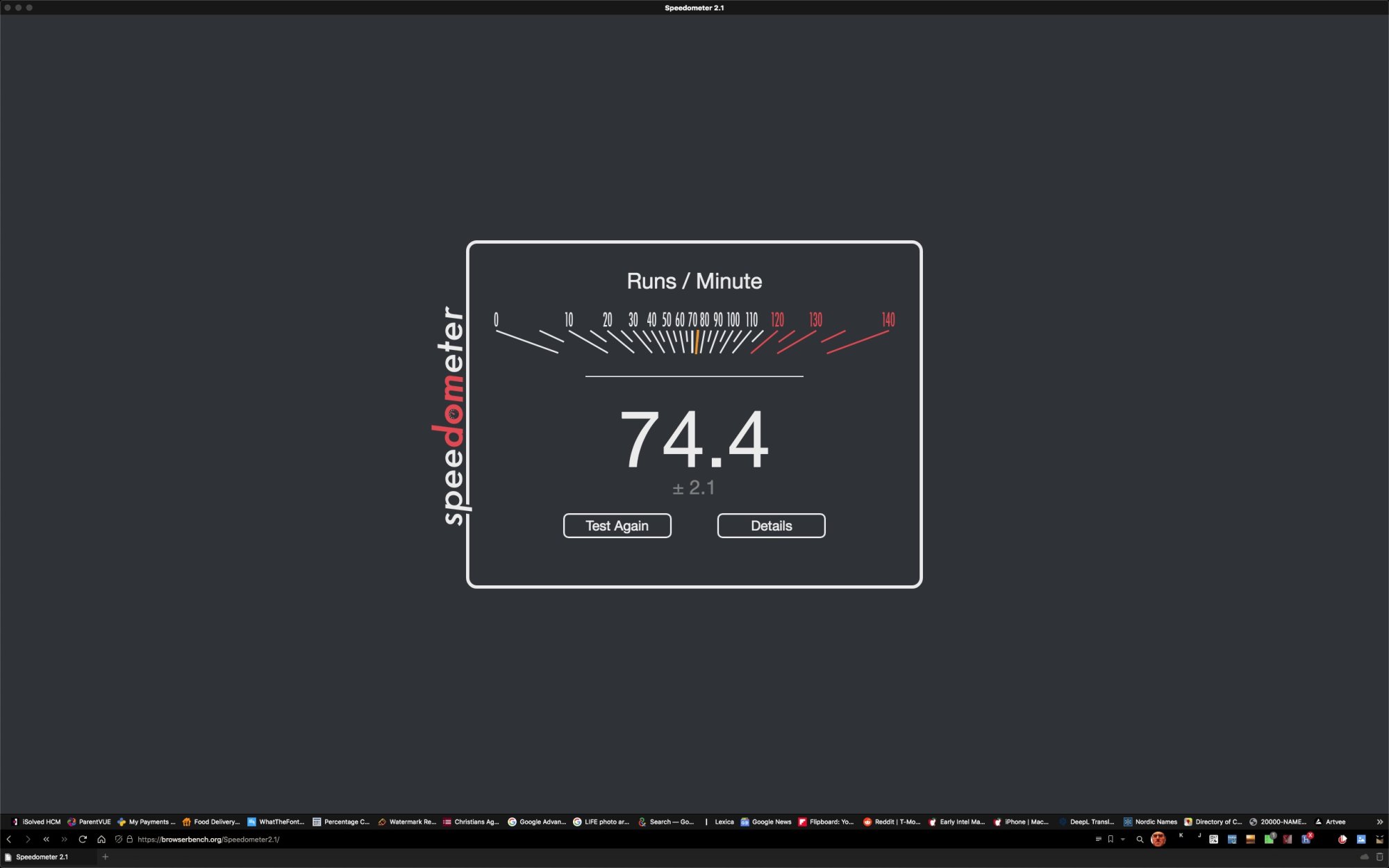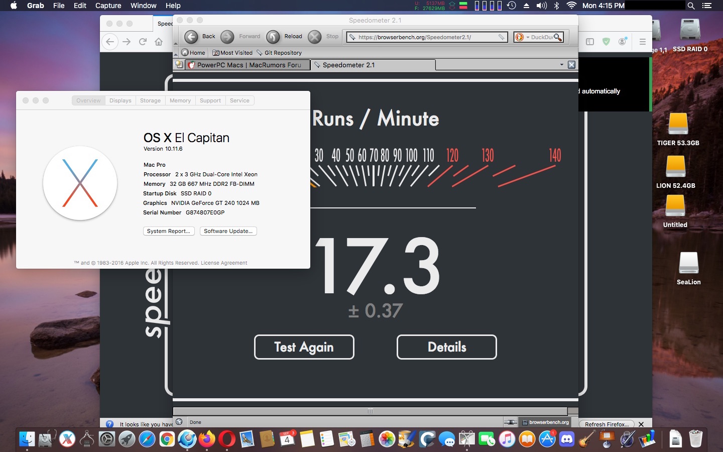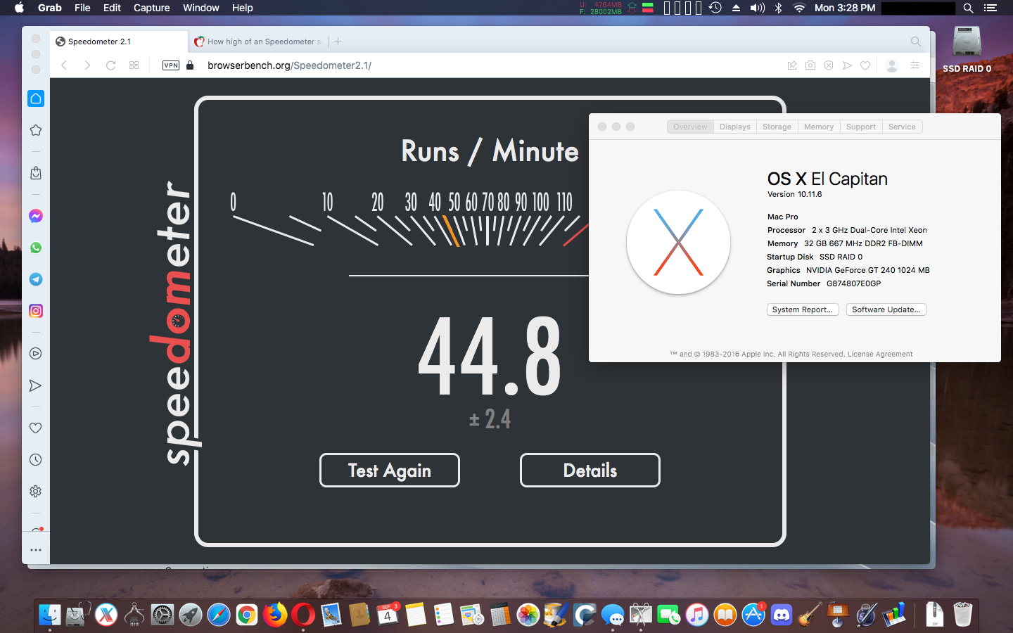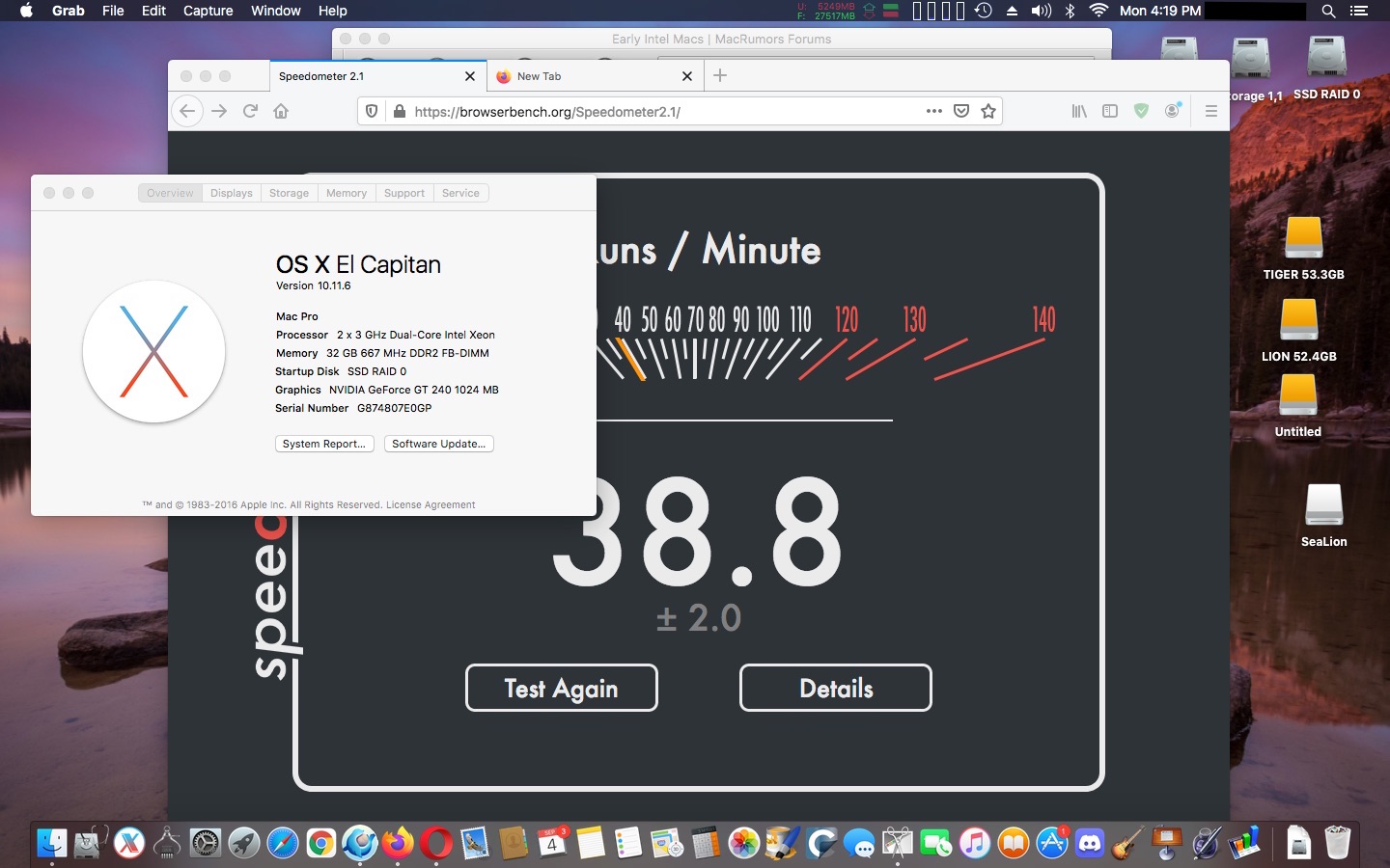 Opera 89.0.4 64bit yielded the fastest results which I found very surprising as it is by far the fatty of the three. This score was very similar to my core2duo a1078 08 mb and 08mbp. Id have thought the increased ram and cores of the cMP (quad core + 32gb ram and SSD raid0) would have anchored better results compared to a dualcore 2/2.3ghz 8gb ram portable.