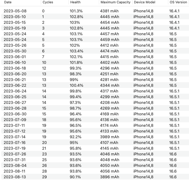 A month and 10 cycles later, don't think my 14 Plus is faring too well. Never discharged below 30%, Optimised battery charging enabled, only use a 5W charger, no gaming or social media at all. Coconut Battery says battery was manufactured in Feb 2023.. What gives 🤷♂️The battery on 2 month old iPhone 14 plus has been degrading at an alarming rate after only 19 cycles. Methinks 16.5.1 has been a dumpster fire or the 14 series has just shipped with dud batteries