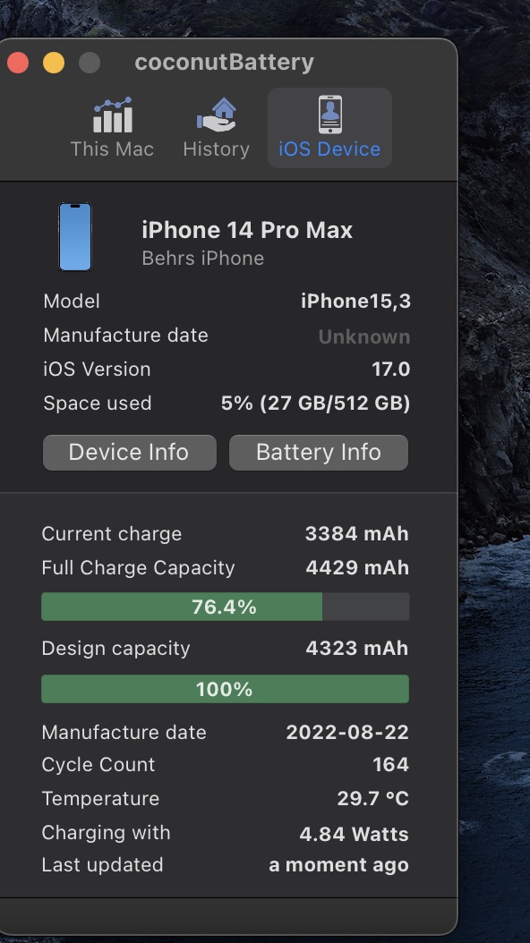 Foremost, the health percentage reported by iOS (in Settings) is a calculation, could simply be an average of logged full capacity readings and/or even the highest. Either way, Apple’s official battery health gauge is going to have higher accuracy than coconutBattery’s at this moment reporting.I feel like the battery capacity reporting could be a bug in iOS 16.