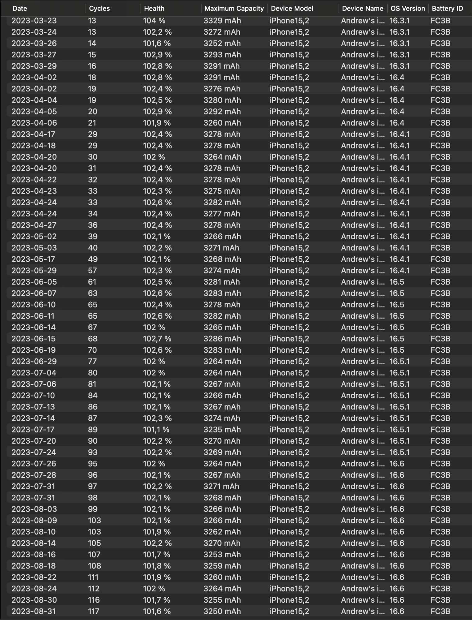 TBH, it could be a lot of factors and some combination of...Launch day 14PM. I'm at 90% according to the phone but I haven't run coconut in a while. Up until a few weeks ago, I charged only through the apple magsafe puck. Now i'm using a modrn dock. Seems really high deg compared to previous models.