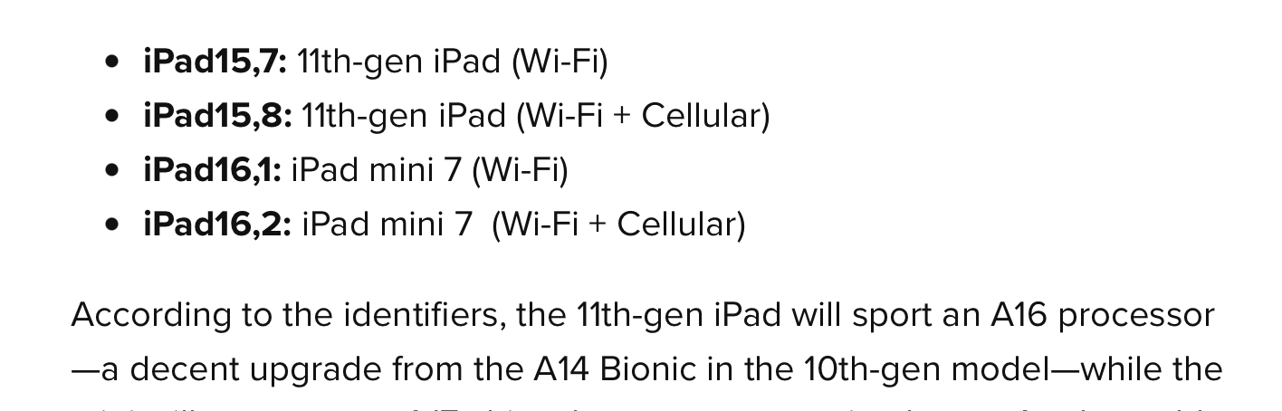 But there are also a lot of unreleased iPads on the list that we know won't come out because they would already be obsolete. It doesn't actually guarantee an iPad 15,7 and iPad 15,8 will come out... there could be an iPad 16,3 and iPad 16,4 come out as the 11th-gen iPad instead.