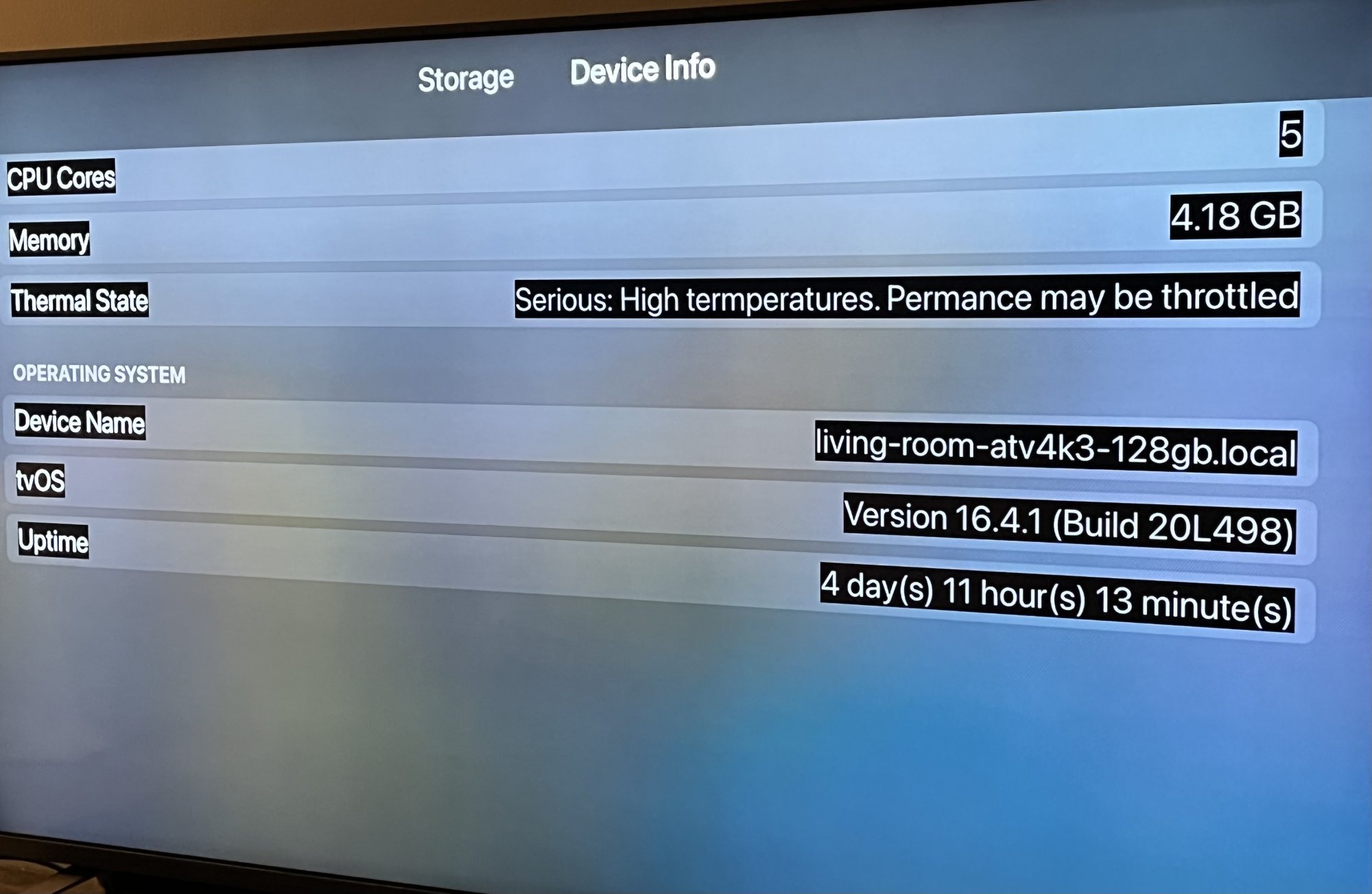 Here is a screenshot from a system utility app on tvOS. Spelling aside, it only takes a few minutes of a graphically-demanding game to see it go from normal to high: