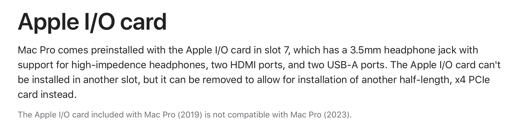 The Mac Pro has two Ethernet Ports and two HDMI ports also. Even before get to the "x16+x8 PCI-e v4" have already doubled up on the Mac Studio Ultra. ( the external USB-A is the same ... but somewhat running out of space on the custom I/O add-in card ( headphone jack , two HDMI , two USB A ). The six thunderbolt basically fill up the edge on that card also.